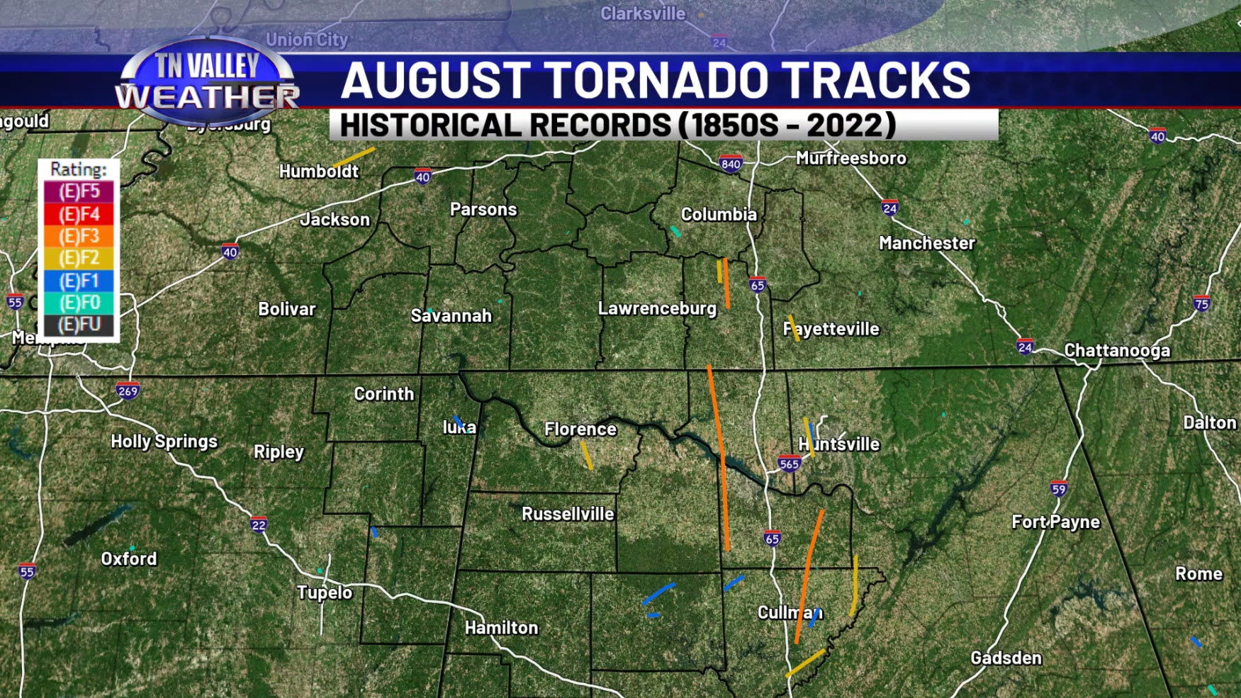 One of those inland impacts we have to think about is tornado activity. It is very normal for landfalling tropical systems to produce tornadoes in the outer rand bands on the right side of their circulation, relative to forward motion. Our area doesn’t see many tornadoes in the month of August from a historical standpoint, but when we do, they are almost always related to landfalling tropical systems. One such event was in association with Hurricane Danny in 1985. The remnants of Danny brought a significant tornado outbreak to the Tennessee Valley in August of 1985. Multiple long-track strong tornadoes (something that isn’t unheard of from tropical systems but isn’t statistically frequent) were spawned across north Alabama into southern Tennessee, including three separate F3 tornadoes within our viewing area counties alone!