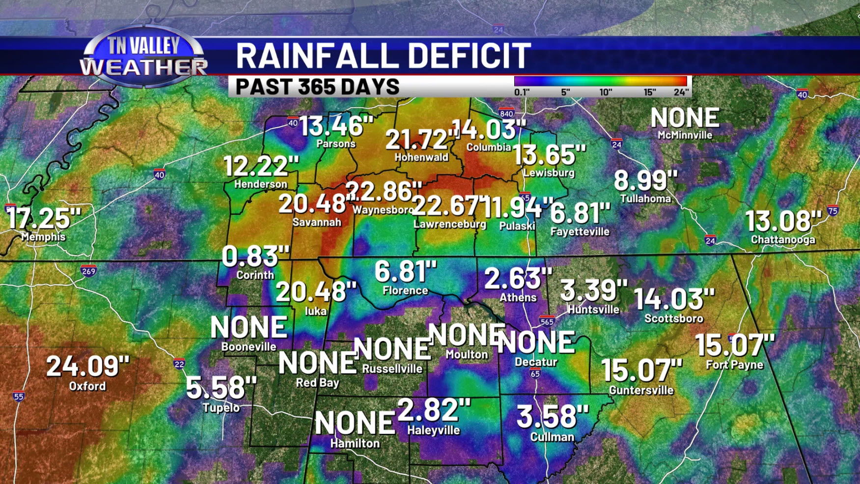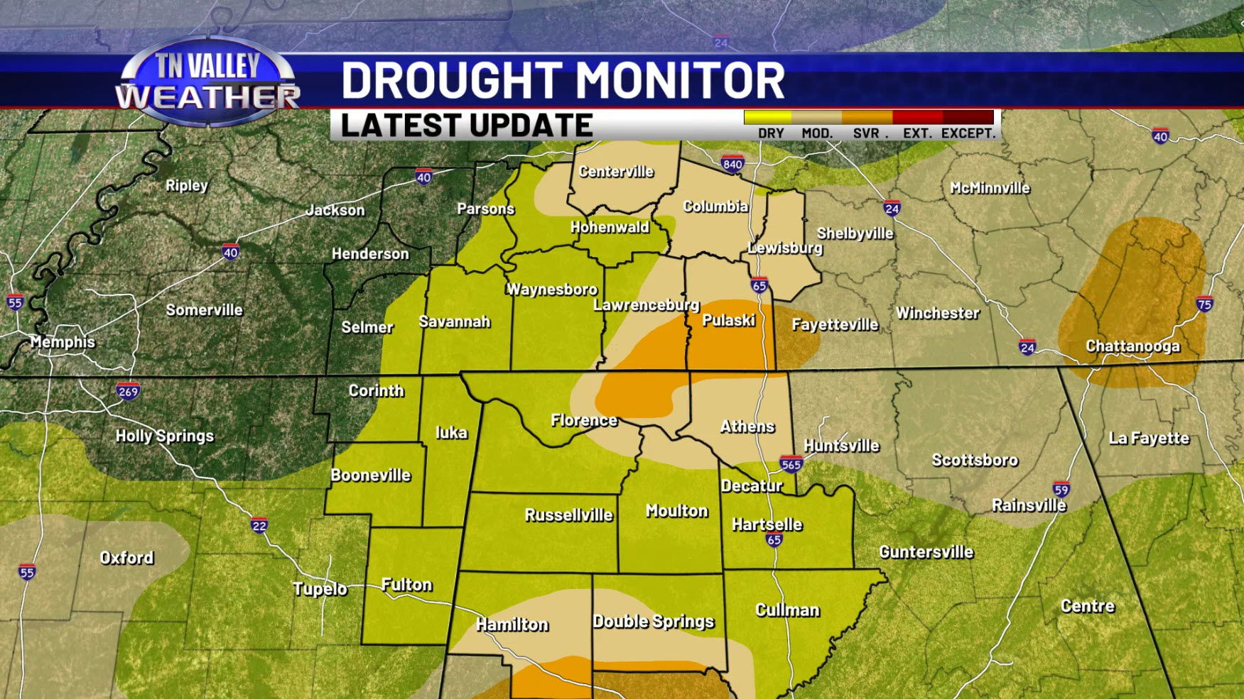 So, now that we are into early August, we look ahead to what the weather may bring to our corner of the Tennessee Valley. To do that, we look at climatology for the area to get an idea of how the weather “typically” stacks up for our area for the month. Our local region’s NWS climate reporting station is at the Northwest Alabama Regional Airport in Muscle Shoals, and despite it being there, those numbers are also very representative of what is normal for the part of southern Tennessee that we service, in addition to northwest Alabama. Looking at the numbers, as you’d expect, August is a hot month here. Our average daytime high is 91 degrees, with that average high starting at 92 at the beginning of the month before easing down slightly to 90 as we round out August and get ready to head into September and the start of meteorological fall. We can certainly get hotter than that though! The monthly record high at the Muscle Shoals reporting site is 108, set back in 1930, and we can frequently have bouts of triple digit heat this time of year. Our average morning low is right around 70 degrees, but oddly enough, we have been as chilly as the upper 40s in the month of August during the overnight! The monthly record low for this reporting site is 47, set in 1917! Despite getting scattered pop-up thundershowers during many afternoons, outside of having tropical systems or the occasional thunderstorm complex, August is the beginning of the drier season for us that stretches through October. The average monthly rainfall for our area is around 3.77 inches. That’s certainly not good news considering the drought conditions we are currently dealing with!