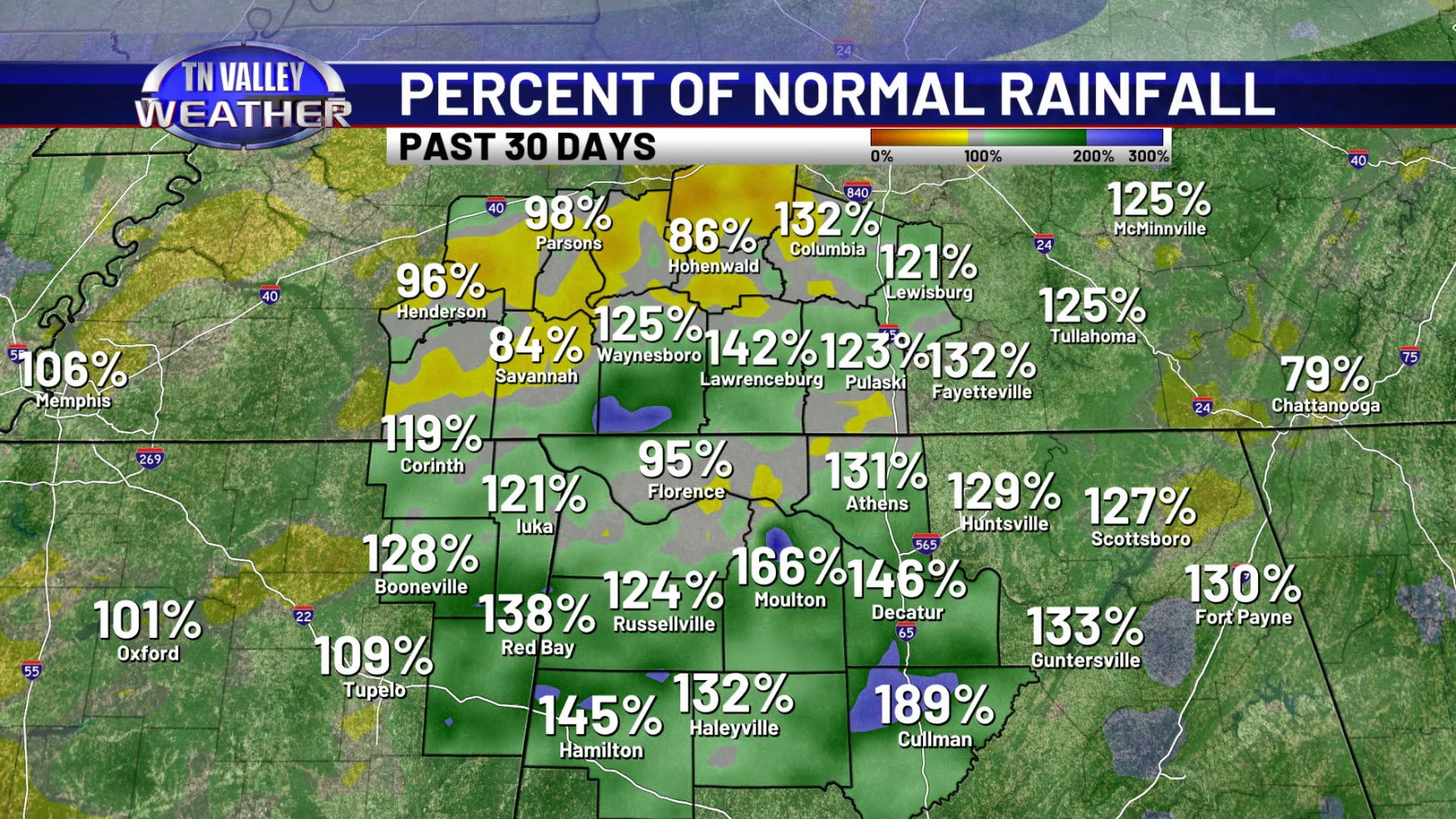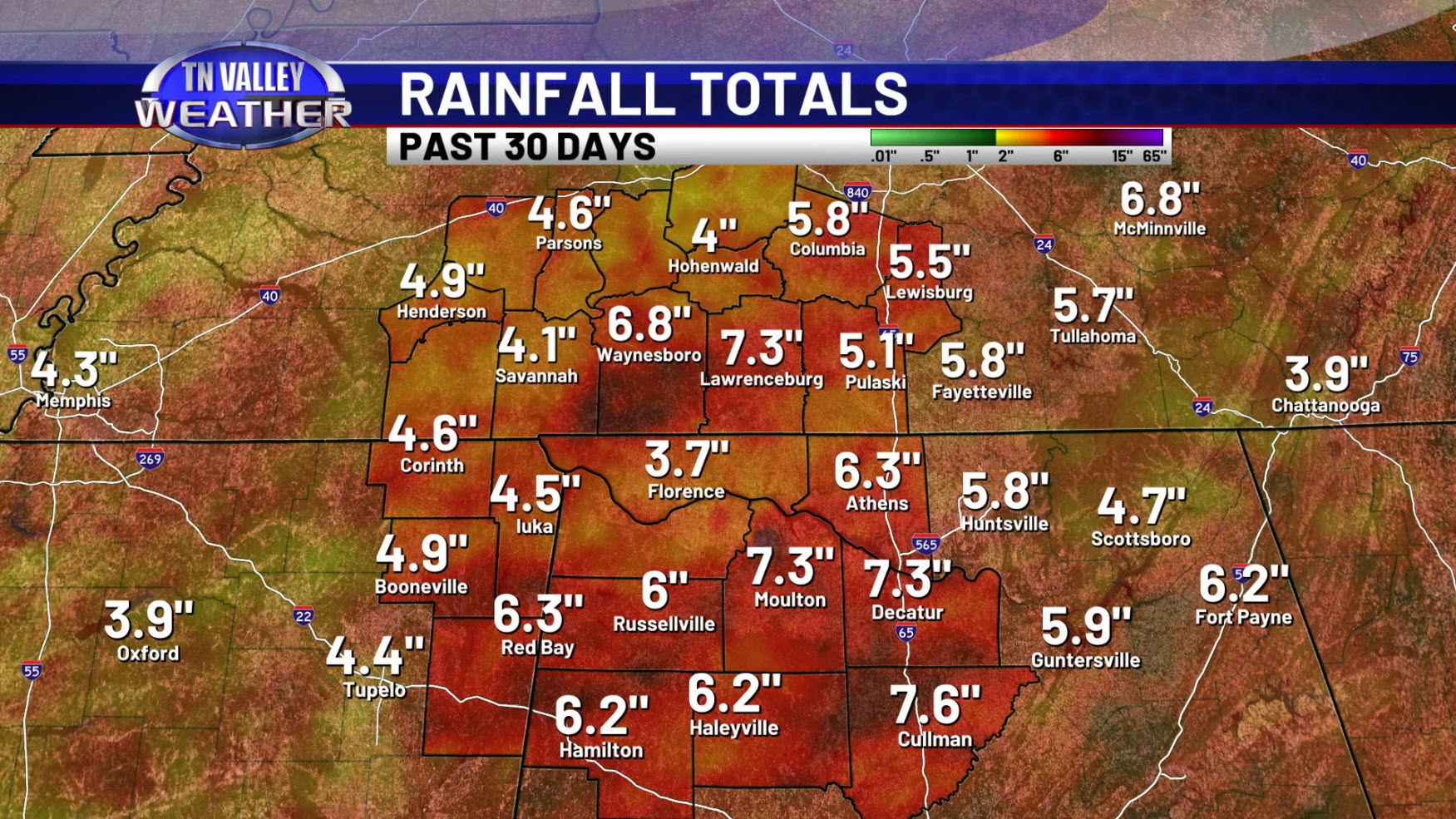 We come bearing good news! After struggling to see much of any rain for the month of June and into the first part of July, we’ve turned the corner over the past few weeks in the rainfall department. Over the last 30 days, many locations across the Tennessee Valley have seen a cumulative 4 to 5 inches of rain, with several locations in the 6 to 8 inch range. This hasn’t removed drought conditions for the whole area, but it has significantly worked upon improving those conditions. Still, there is a significant long-term rainfall deficit across southern Tennessee; so, we have to be careful with how long we stay in dry weather… but even those longer term deficit numbers aren’t quite as large as they were just a month ago!