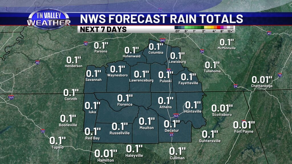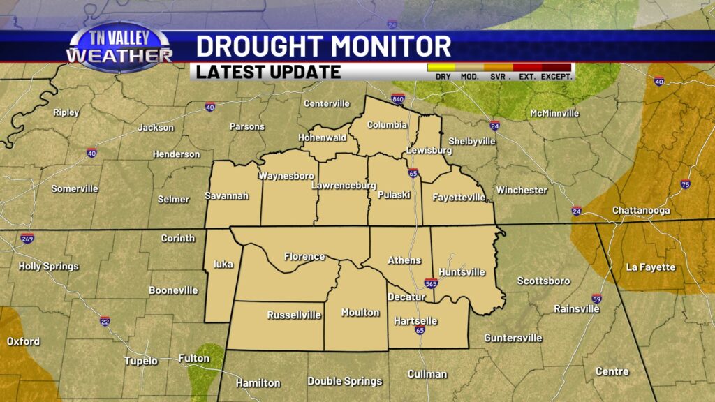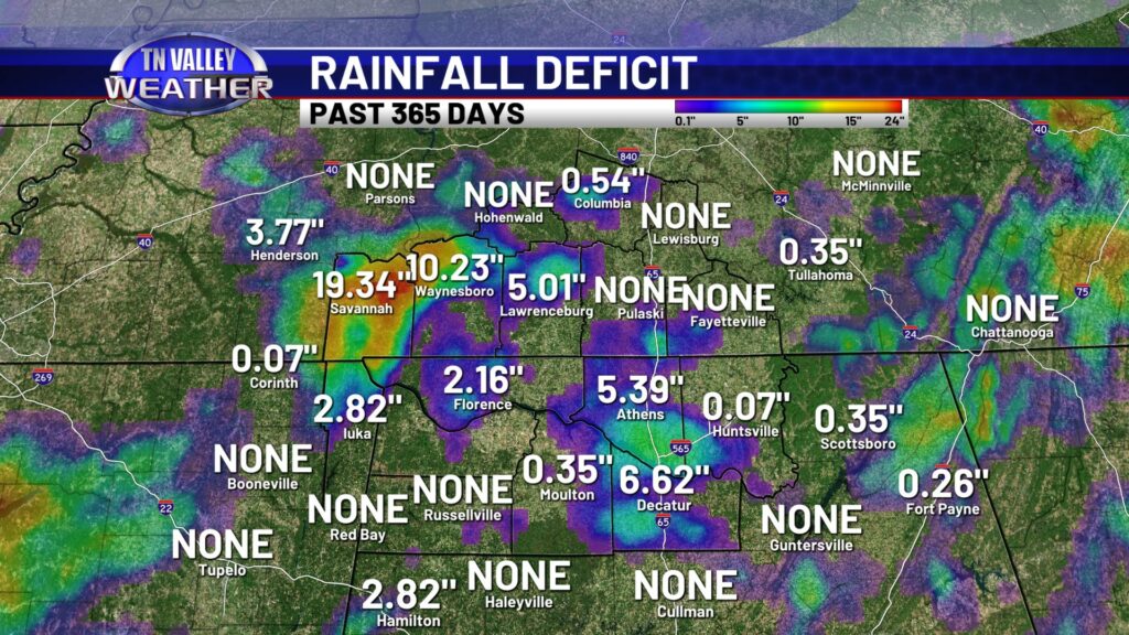 Drought conditions continue across the Tennessee Valley, despite the rainfall at the end of the past week. All of the Tennessee Valley is officially ranked in “Moderate” drought conditions. It is possible that some of the areas with rain totals over 1.5″ from the event last week could step down to “Abnormally Dry” on the update that comes out Thursday, but it’s not a guarantee. In the larger scope of things, the higher rainfall totals with last week’s system stayed to our south, and while we did get a good soaking that has improved top layer soil moisture a little bit, we’re still running anywhere from 40-60% of what is considered normal rainfall for the past 30 calendar days, with only a few areas from Iuka to the Shoals to Lawrenceburg to Lewisburg and then another area around Red Bay to Russellville in the 65-80% of what is normal range. Long-term rainfall deficits still aren’t bad at face value, but this is still mainly driven by the very wet first half of 2025. Once we shift deeper into this year to where those rain totals from last year start falling off the ledger for this count, those numbers will start to go downhill unless we start seeing significant rainfall soon.