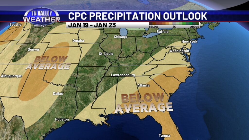 The bad news is that we don’t have big rain in the forecast in the foreseeable future. We DO have the decent chance of a few showers on Wednesday, and the chance of a few more Friday night into Saturday. Both events may actually transition over to some light flurries at their ends. But it doesn’t look like there’s going to be much in the way of moisture content. The NWS rainfall forecast for the next 7 days is below a quarter inch everywhere, with many folks closer to a tenth of an inch. The NWS Climate Prediction Center’s 6-10 Day Precipitation Outlook is highlighting near to below average precipitation from January 19th to 23rd. It doesn’t mean there won’t be any, but it’s more likely that it will run below average for what is normal for that time than above average. Their 8-14 Day outlook for January 21st through 27th DOES hint at maybe a more active pattern, with some bit of confidence of above average precipitation chances for the Lower Mississippi and Tennessee Valleys up into the Ohio Valley. Confidence isn’t overly high just yet, but those percentages COULD increase as we get closer. We’ll see. The main takeaway is that even though there are a few shower chances in the future, the rain we had last week was helpful but not enough, and drought conditions will continue for now!