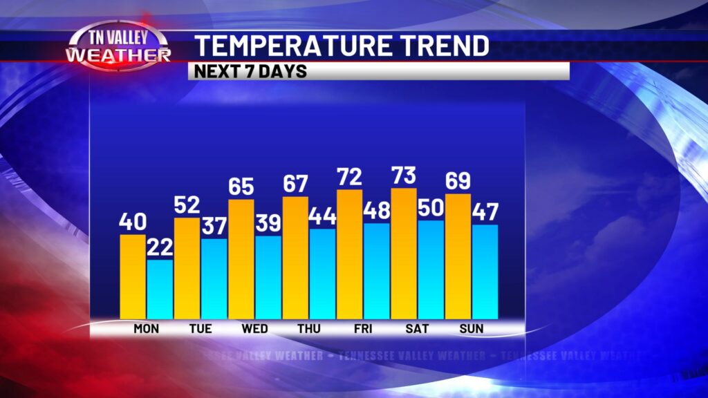 We’re back into the 50s by Tuesday, and back into the 60s by Wednesday. By Friday, we’ll be feeling warm once again with highs reaching the low to mid 70s. We stay dry until our next rain chance Sunday.