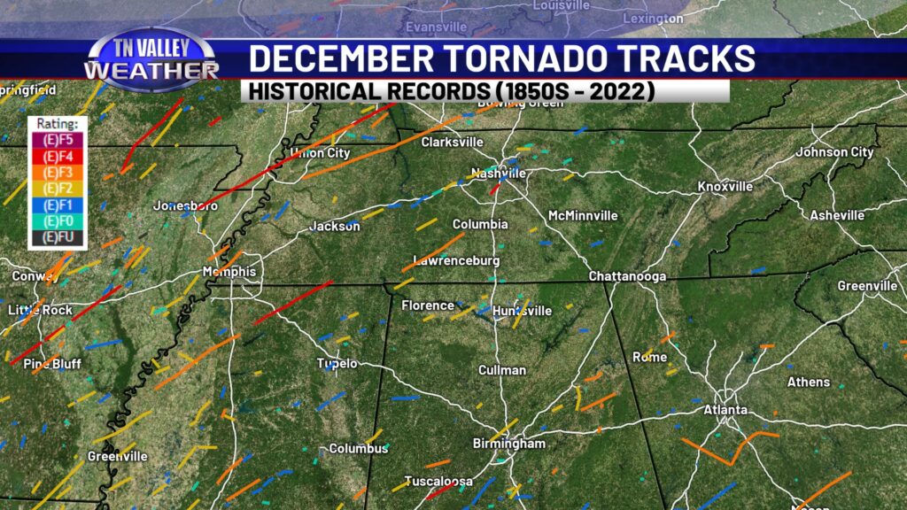 With the storm track shifting closer to us and becoming more active, that means severe storms and tornadoes are sometimes a significant concern. Our local area’s tornado season runs from November through the end of May, and we are no stranger at all to tornadoes in December! Our region overall has a long history of strong (EF2/F2 and greater) and sometimes long-track type tornadoes in the month of December. While they don’t happen quite as frequently as during March and April, they can sometimes be just as intense and impactful!