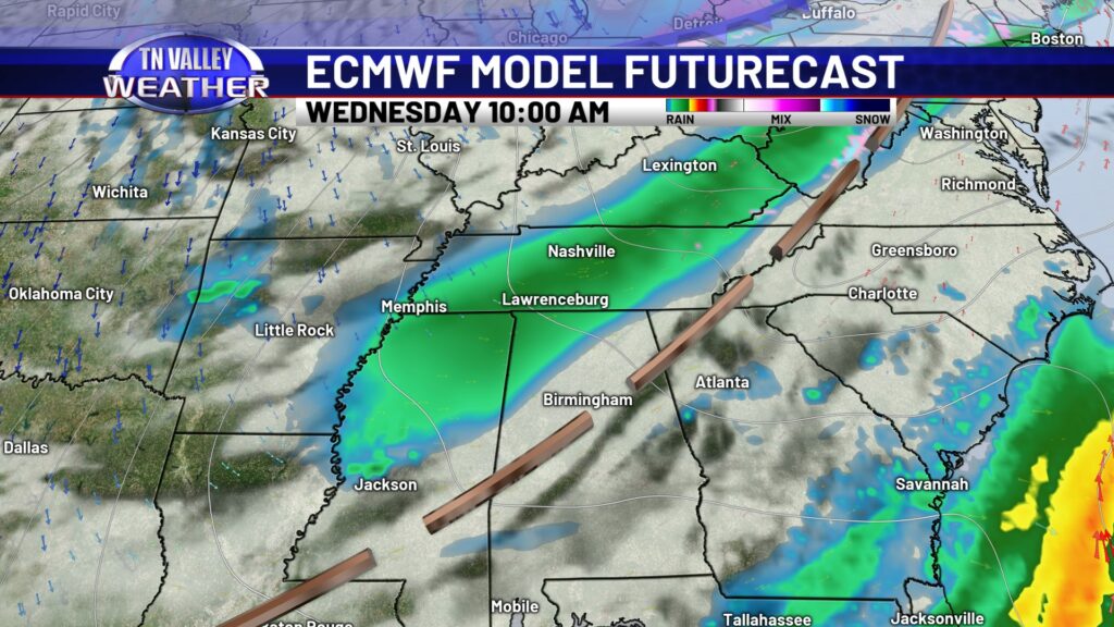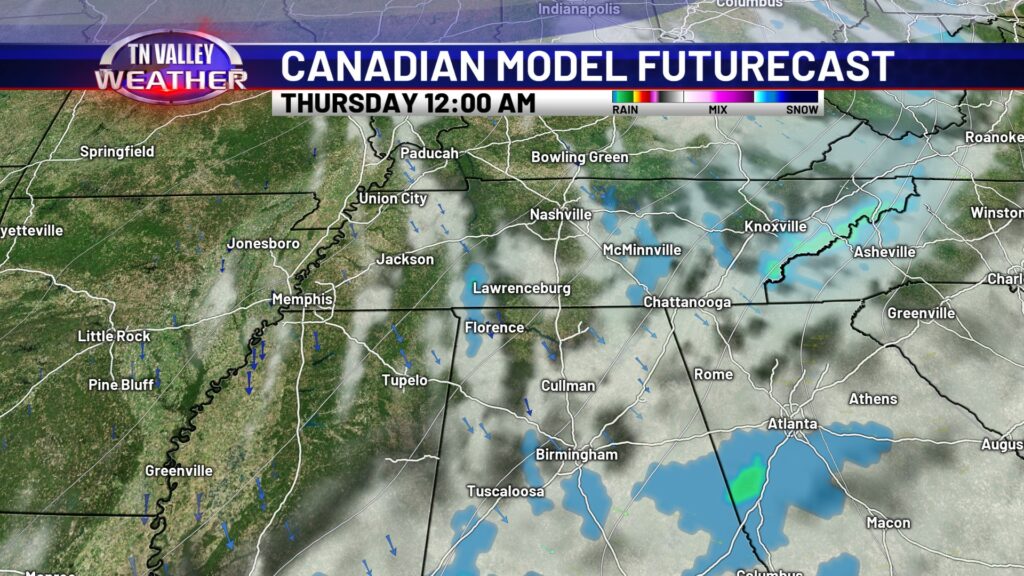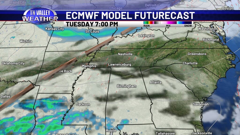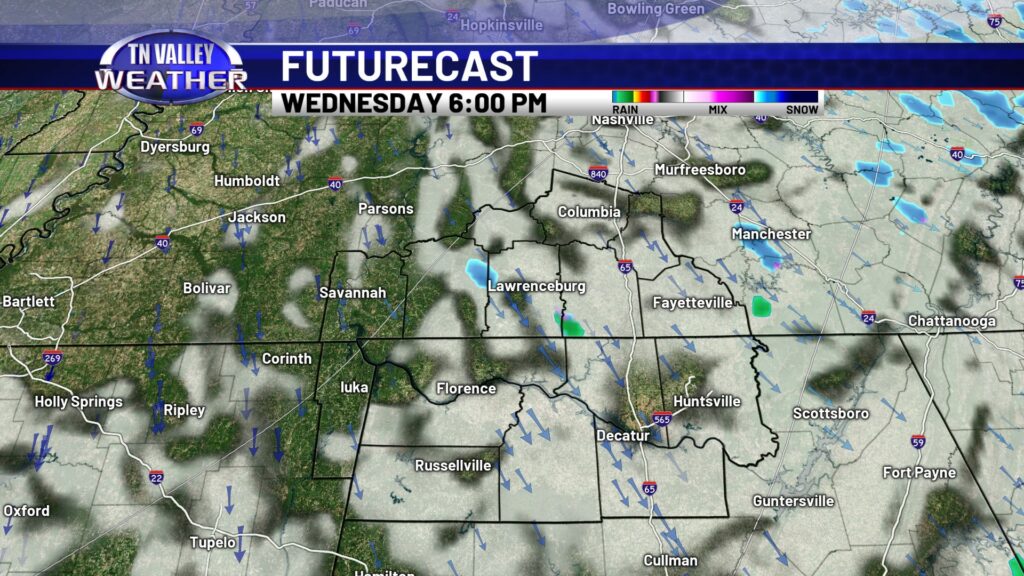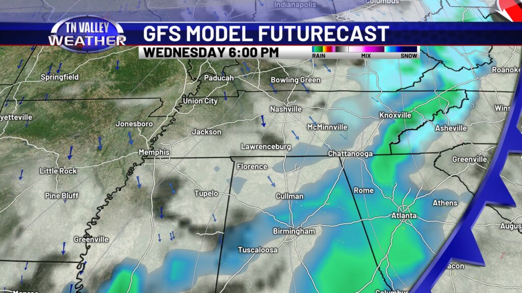 Tuesday is looking warmer with highs in the upper 50s thanks to southerly winds 10-15mph. Clouds will increase overnight ahead of the next weathermaker for the Tennessee Valley. Scattered rain showers will move in by Wednesday morning/afternoon as temperatures are still well above freezing. Once the bulk of the moisture moves out, northerly winds will send in some very cold air, getting us below freezing. The question that needs to be answered: will there be any moisture left when temps fall below 32°? Let’s discuss below.