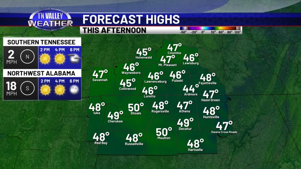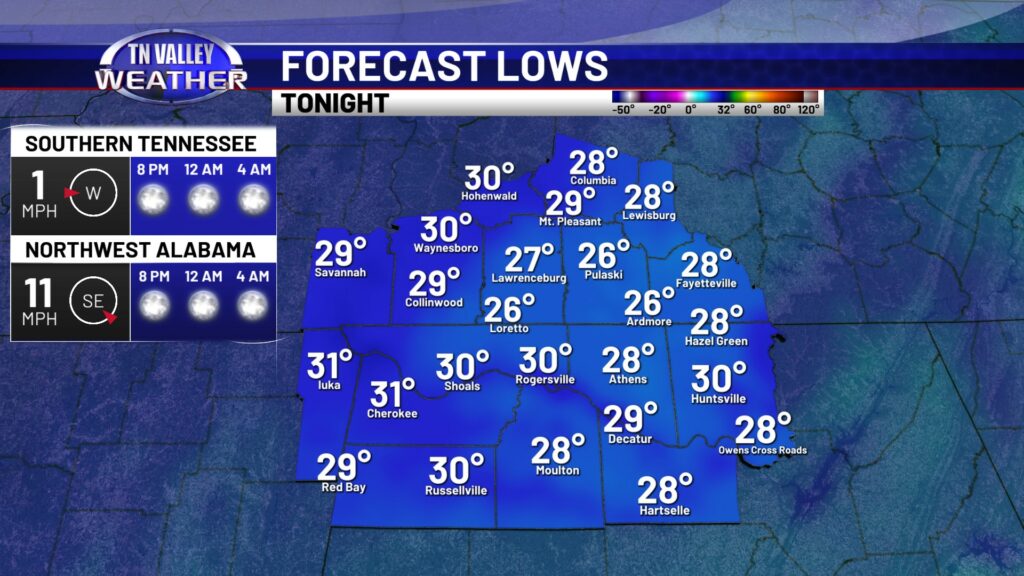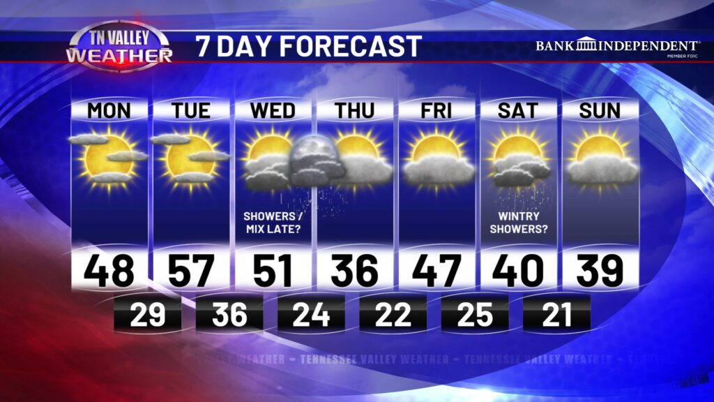 Nothing like an ‘average’ day to kick off the week here in the Tennessee Valley. Enjoy plenty of sunshine! While this morning was cold, this afternoon will be cool but comfortable, with temperatures in the upper 40s to lower 50s. We will be under a clear sky tonight, as temperatures cool of into the upper 20s.
