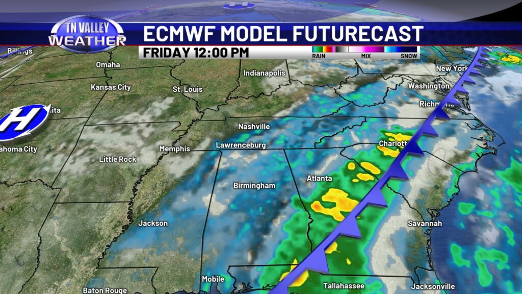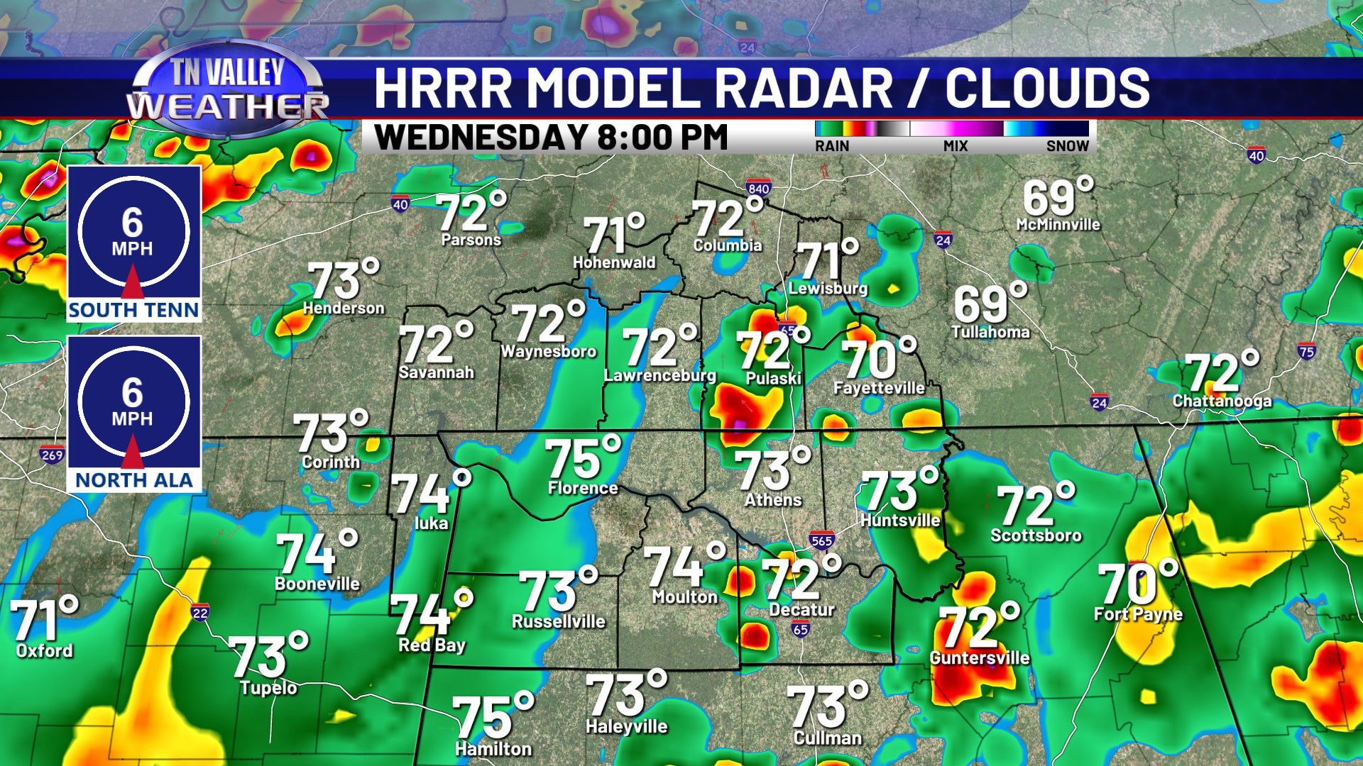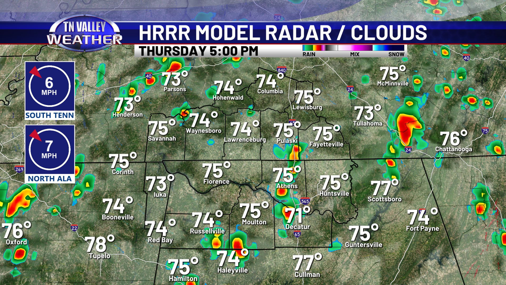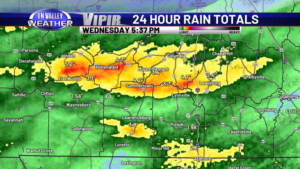 It’s been an active past few days across the Tennessee Valley with multiple rounds of heavy rain and thunderstorms, leading to flash flooding in some areas. Just since early last evening, a large part of southern middle Tennessee has seen near or over 2 inches of rain, with a large swath of 4 to 6 inch rainfall estimates along the Highway 412 corridor. Additional rainfall estimates of 2 to 4 inches have been common in Limestone, Madison, and Morgan Counties in north Alabama with widespread 1″+ rain estimates covering the vast majority of north Alabama elsewhere. Heavier rain has shifted off to our east for now, but we are not done with the rain chances just yet!