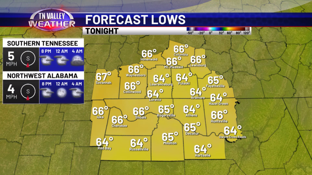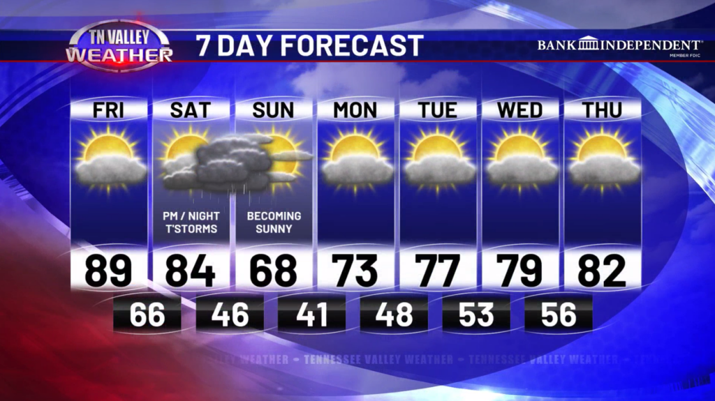 Going into Sunday, we expect a much cooler day with highs in the 60s with decreasing clouds. Sunday night into Monday morning, lows will drop into the upper 30s and lower 40s. At the moment, we don’t expect temperatures to drop far enough that frost becomes an issue.