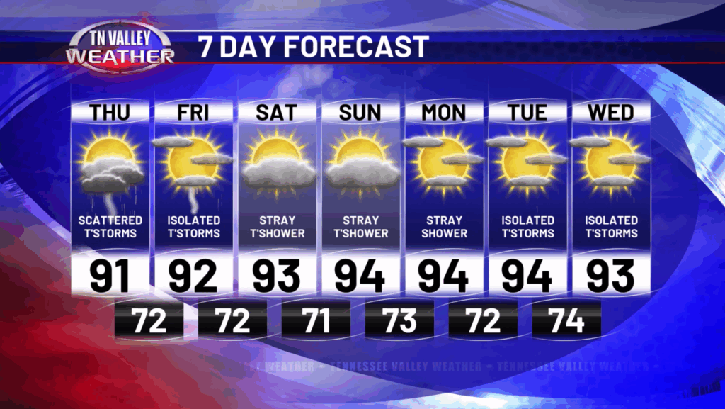 The heat will continue to build in next week with highs into the upper 90s across Northern Alabama and cannot completely ruled out temperatures flirting with that 100 degree mark! With dew points in the upper 60s and lower 70s, heat index values will be in the 100-107 range most likely.