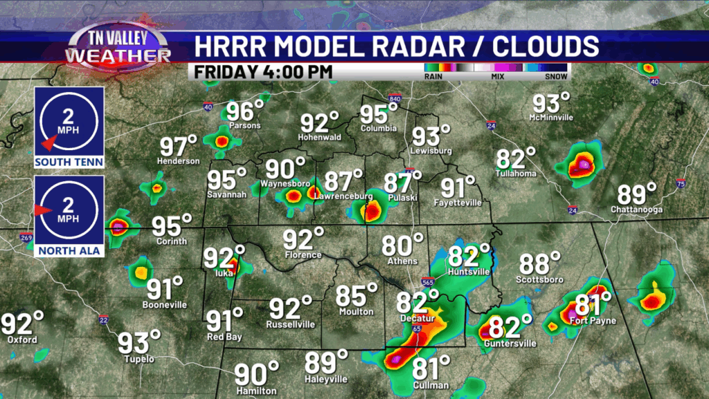 Going into Friday, more showers and storms are expected with even less coverage and highs back into the lower 90s.