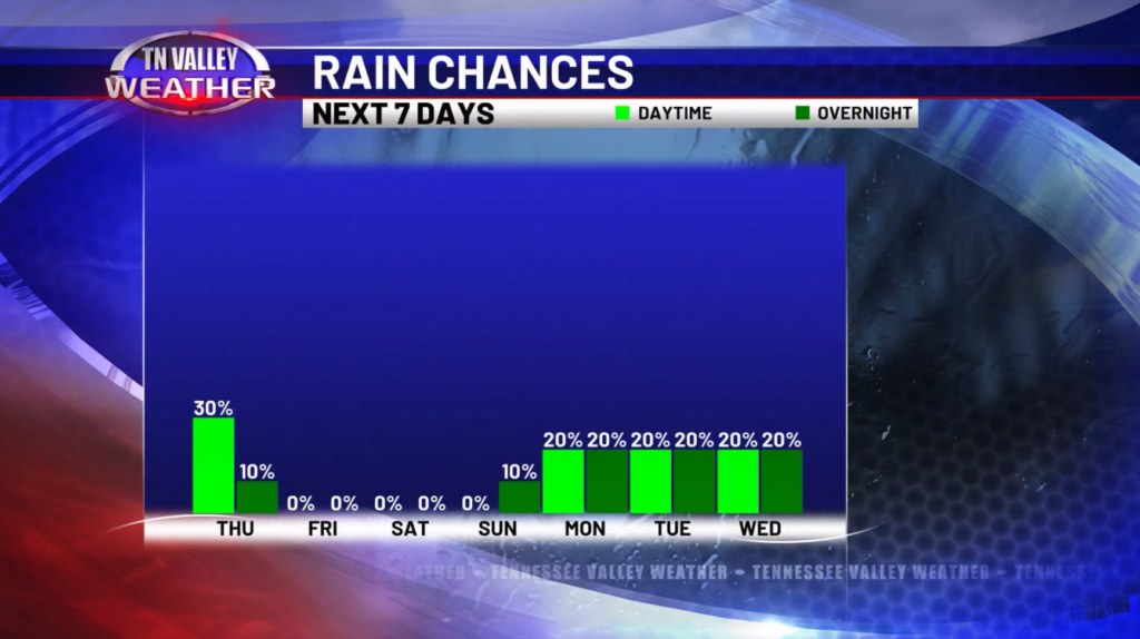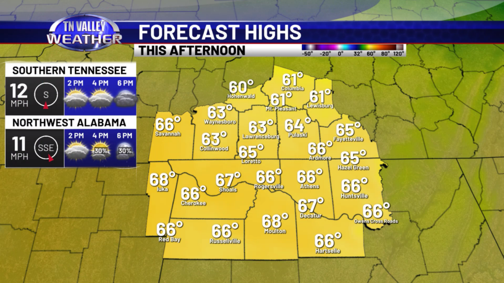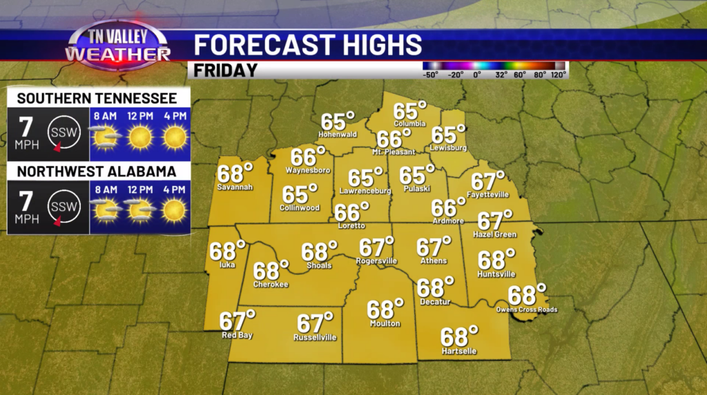 Good Thursday morning! After a round of showers and storms early today, we will gradually begin to lose the cloud cover. Highs should reach the lower to middle 60s today with breezy winds at times. During the afternoon and evening, a stray storm or two could impact parts of Northern Alabama, while Southern Tennessee remains dry. Some small hail and gusty winds could accompany any storms that do develop, but the severe weather threat is rather low. All rain and storm activity should be clear of the area by the overnight hours.