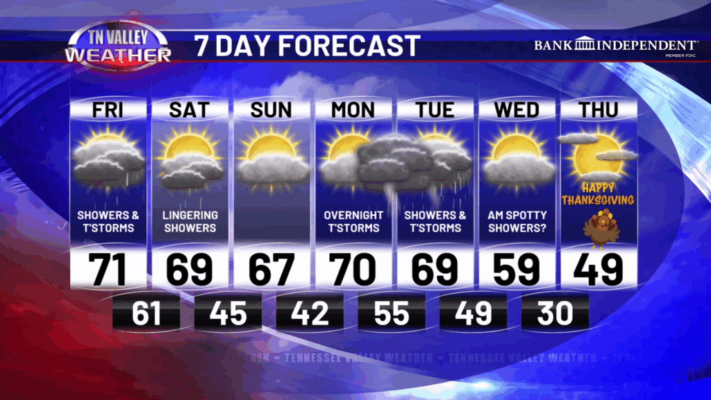 To start off Thanksgiving week, we will be dry during the day on Monday but overnight into Tuesday we will see more rain and storms track on in. We will have to watch for any strong storm threat but for now, that risk is low. Behind that cold front, much cooler air will filter in with highs on Wednesday in the upper 50s and then on Thanksgiving, we will see highs in the 40s! You will definitely need that jacket going to your Thanksgiving lunches and dinners!