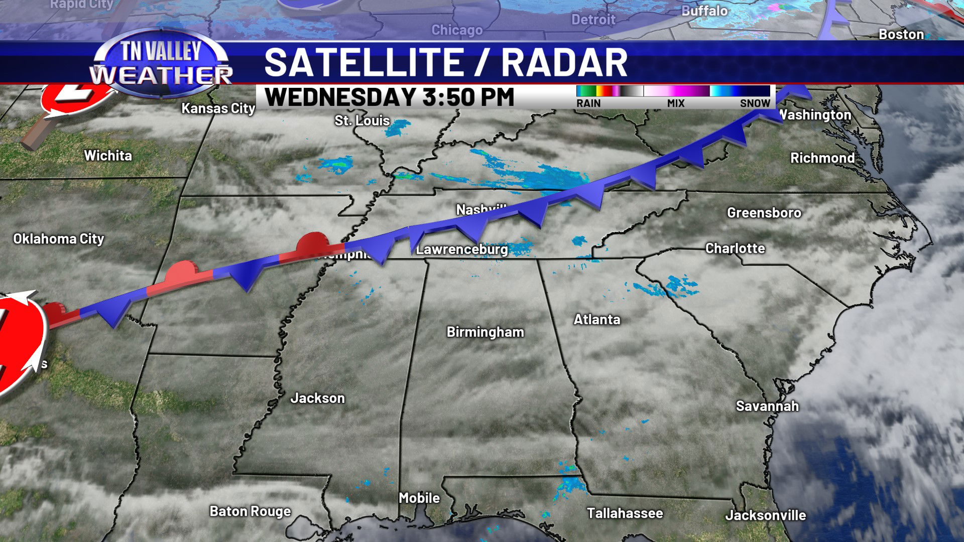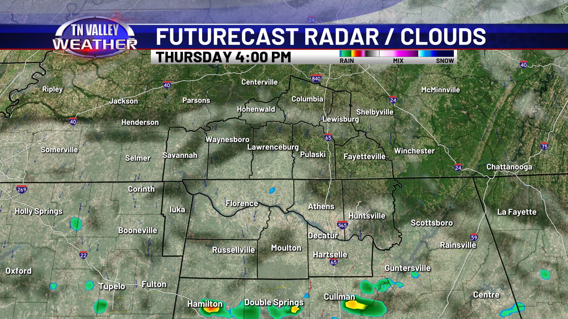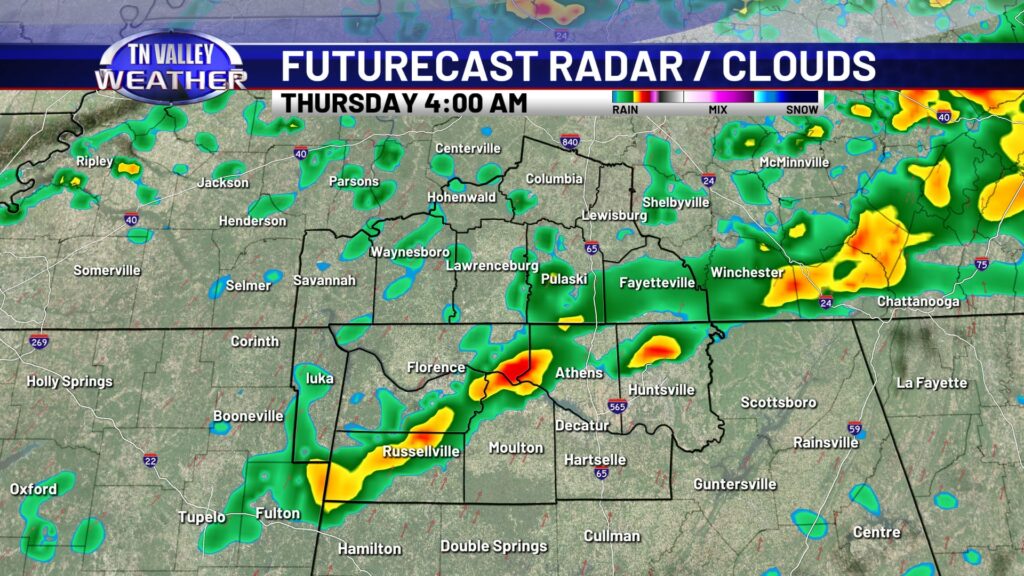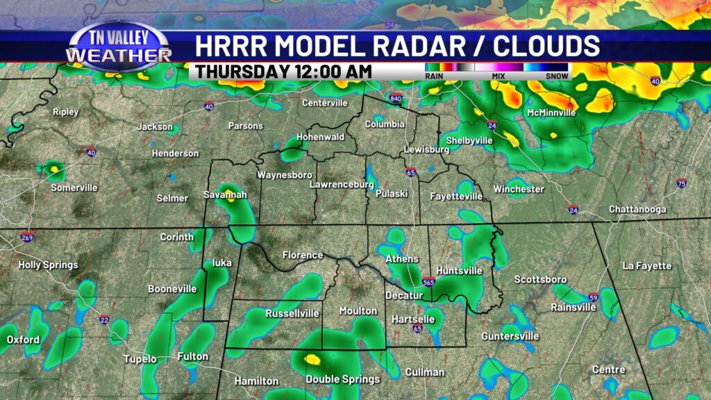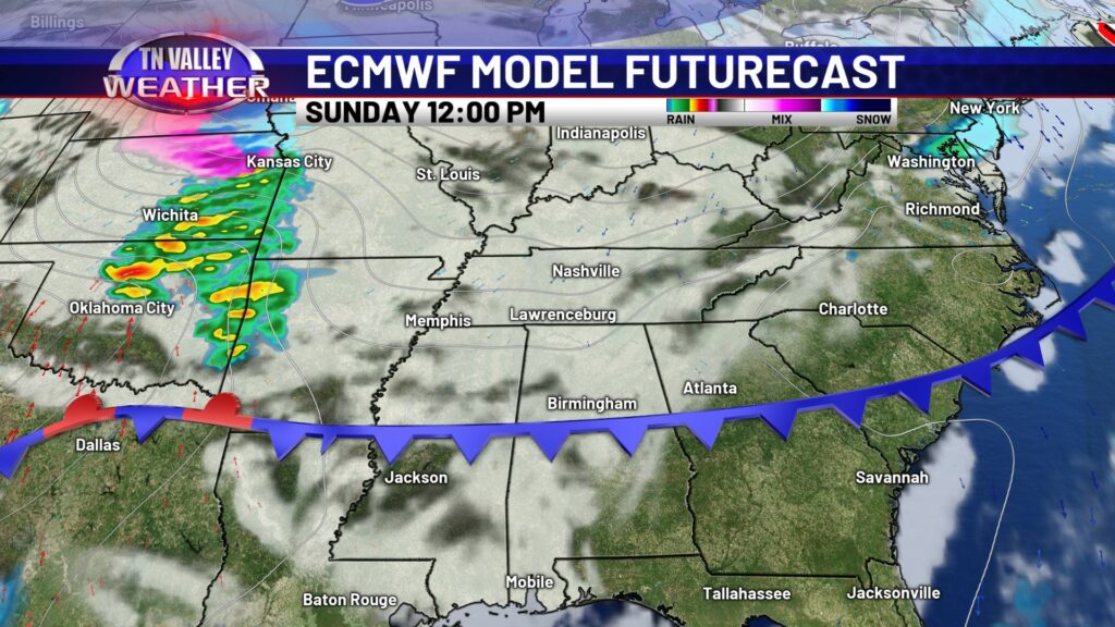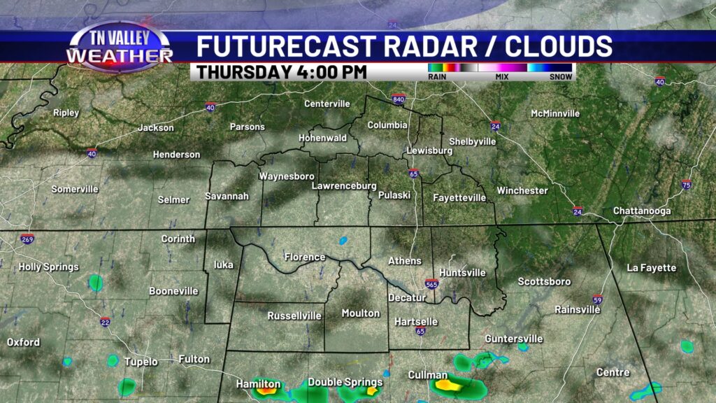Clouds are locked in across the area on this Wednesday. Despite that, temperatures have still managed to climb into the mid to upper 50s along and north of the Tennessee River and into the lower 60s south of there. We have a few light sprinkles on radar across southern Tennessee this afternoon. This is near a frontal boundary that’s draped from Tennessee back into Arkansas and north Texas with a low pressure area back into northern Texas. This will be the catalyst for showers and a few thunderstorms over the next 18 to 24 hours.