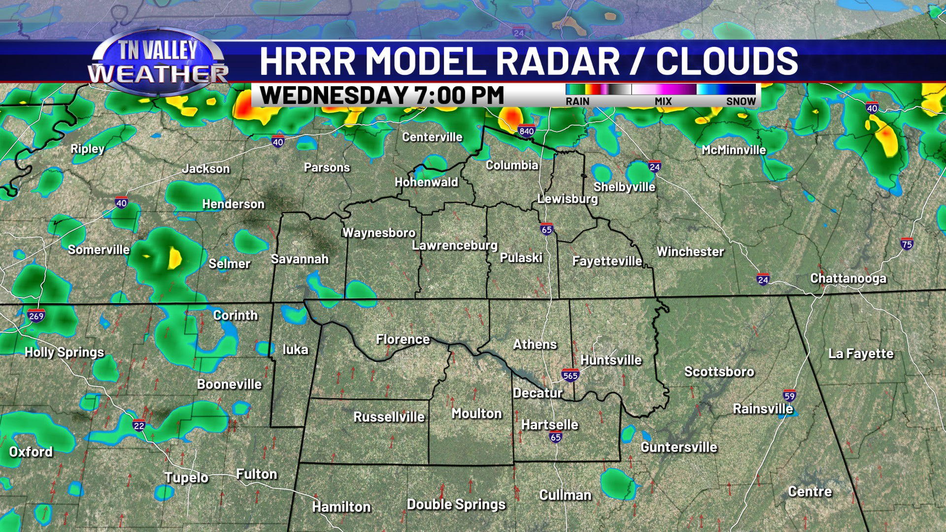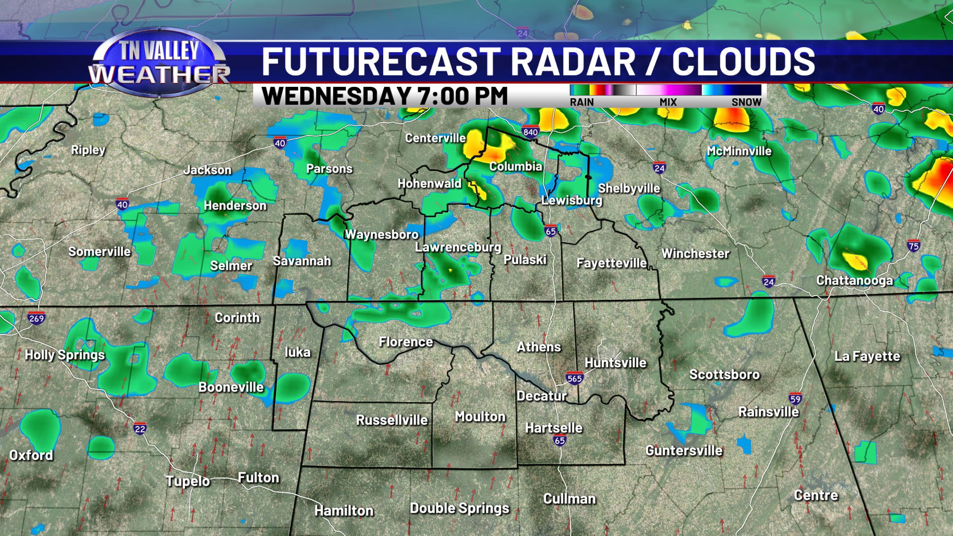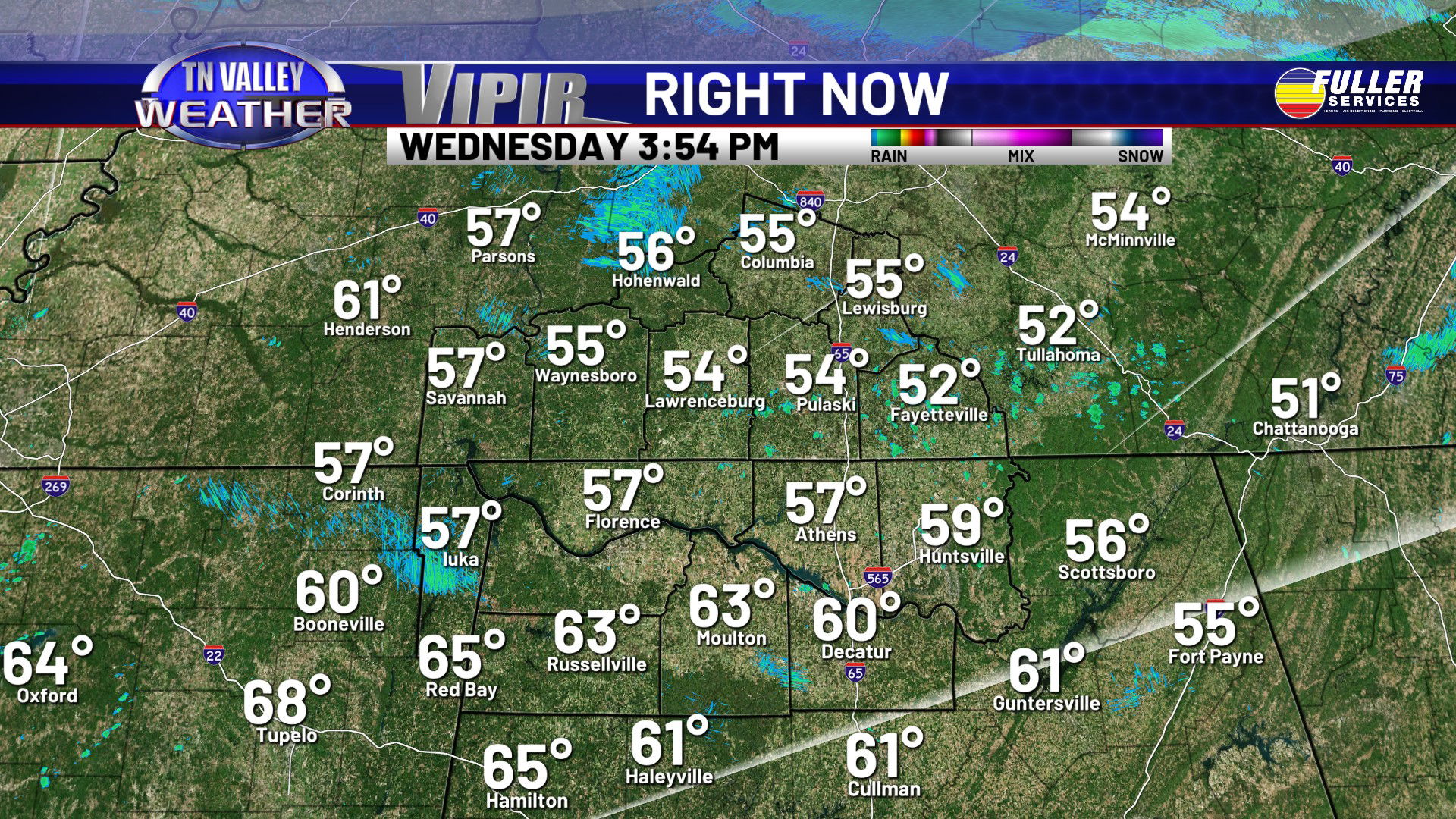 Clouds are locked in across the area on this Wednesday. Despite that, temperatures have still managed to climb into the mid to upper 50s along and north of the Tennessee River and into the lower 60s south of there. We have a few light sprinkles on radar across southern Tennessee this afternoon. This is near a frontal boundary that’s draped from Tennessee back into Arkansas and north Texas with a low pressure area back into northern Texas. This will be the catalyst for showers and a few thunderstorms over the next 18 to 24 hours.