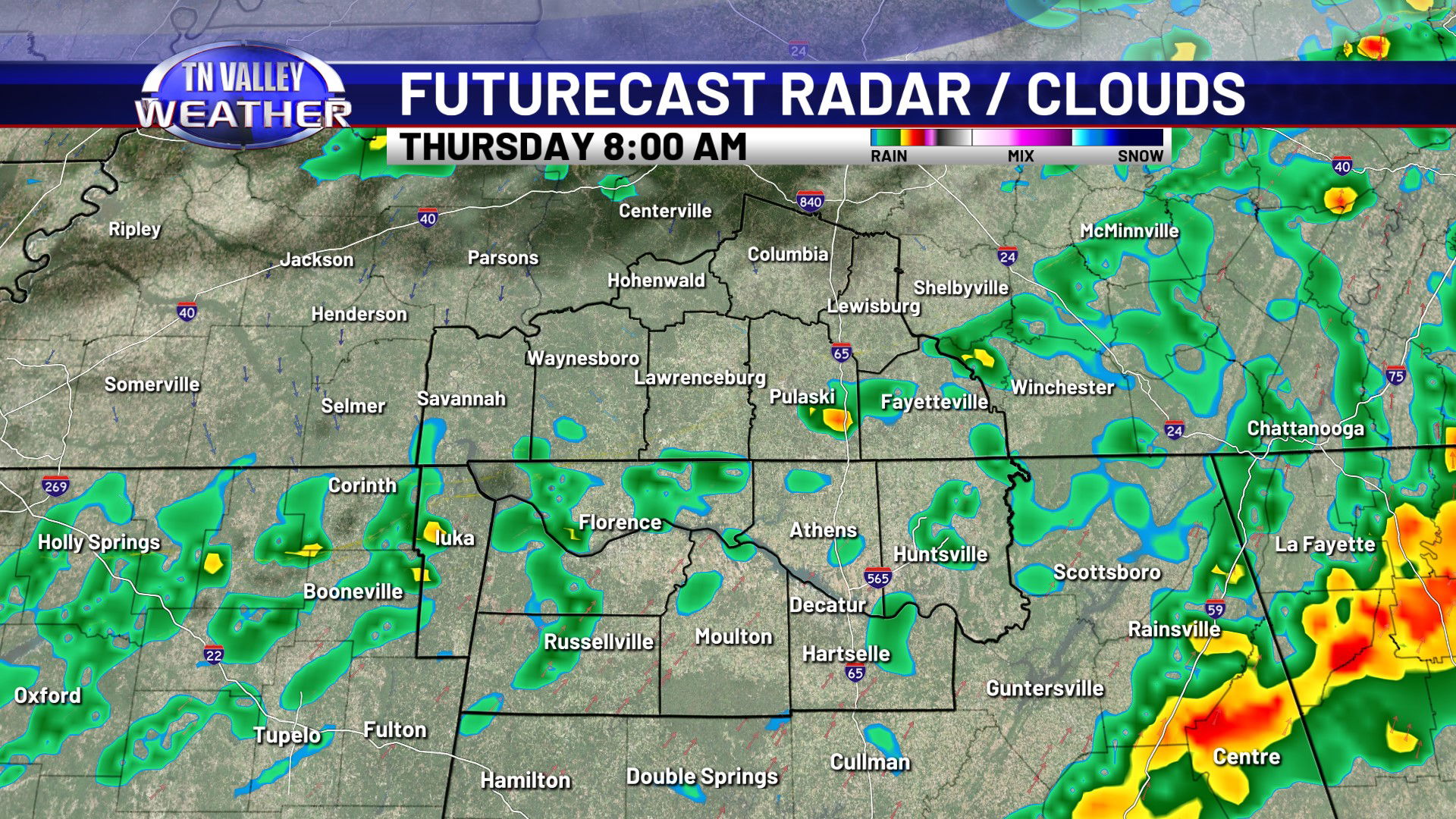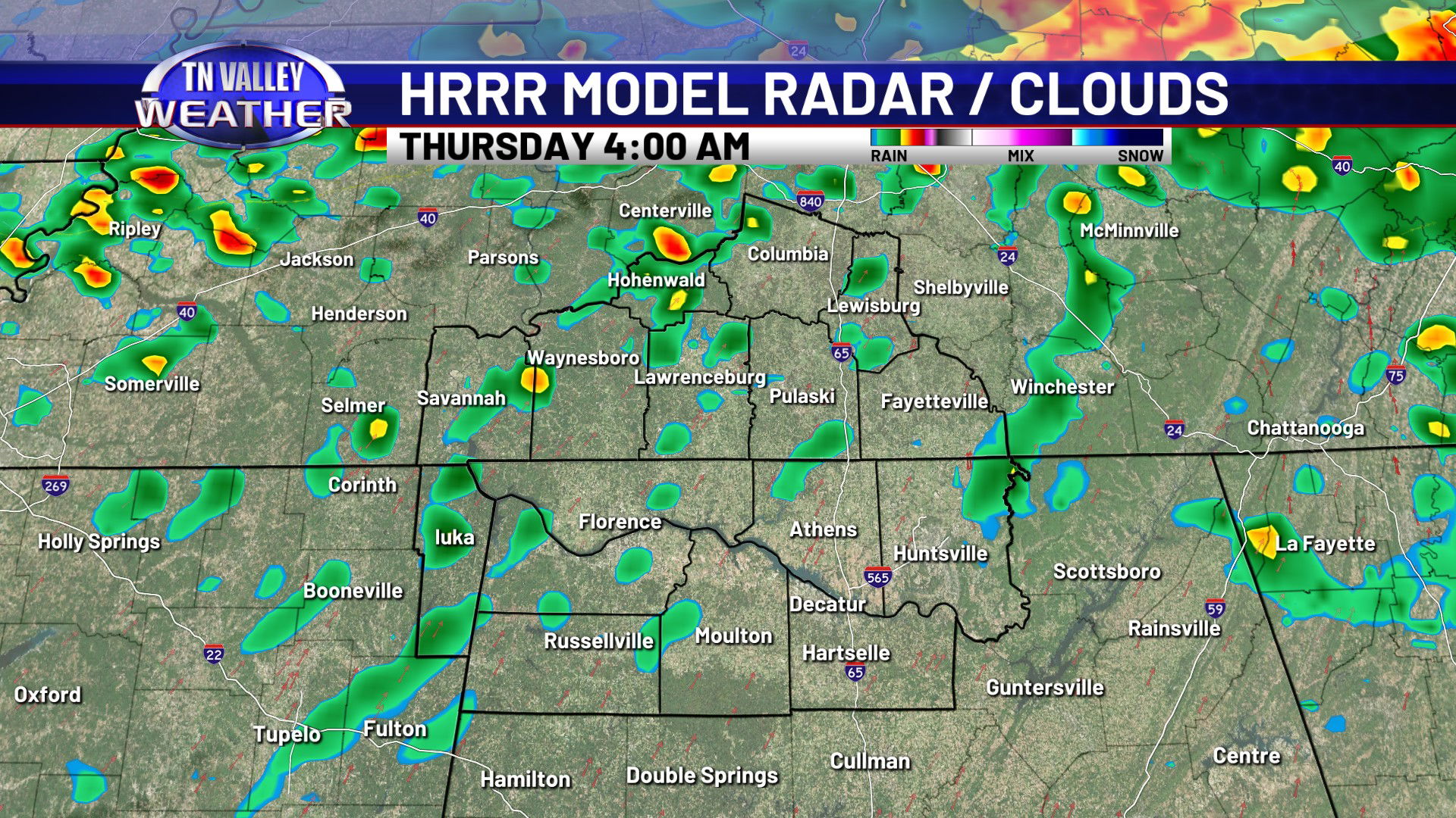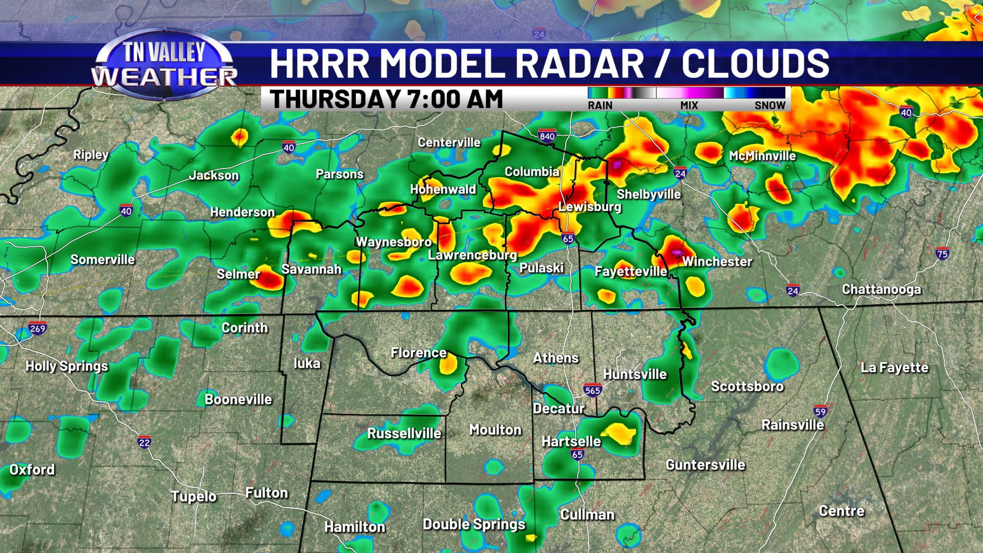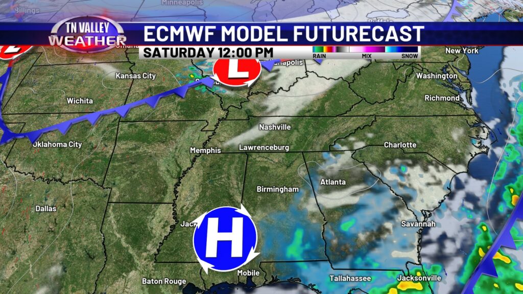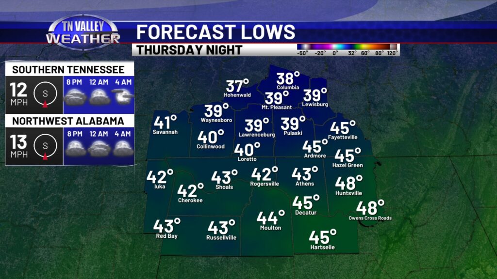 Showers will become more likely as we head into the overnight. Temperatures will stay on the warm side too, with clouds and our breezy south wind continuing. Overnight lows will stay in the low to mid 50s. Showers and storms are most likely during the morning hours of Thursday before shifting south into the afternoon. No severe storms are expected, but some locally heavy rainfall and maybe some isolated 30 mph wind gusts are certainly possible. We may have a lingering shower into the afternoon, but it looks like the majority of the rain is south of us and we return to partially clearing skies by midday and the afternoon. Because of this, we’ve had to bump daytime highs up a little for Thursday, into the mid 60s with a bit more sunshine in the afternoon. Areas north of Highway 64 in southern Tennessee will likely stay closer to the lower 60s though. With more breaks in the cloud cover overnight, we will be a little cooler. We’re still not going to be actually cold though, with no real cold air behind this front. Overnight lows for Thursday night will range from the upper 30s to the mid 40s.