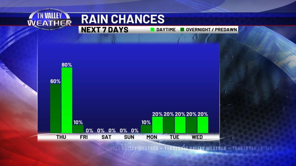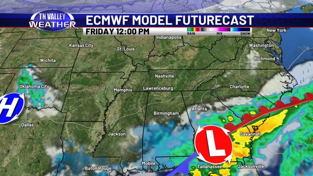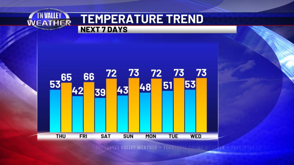 That system is off to our south and moving away by Friday, and we are back to mostly sunny skies and highs in the mid to upper 60s. We’re even warmer for the weekend as we get a southwesterly wind in here again. Daytime highs look to climb into the lower 70s for most everybody across the viewing area, and a few folks in north Alabama could get into the middle 70s. We look to stay dry through the weekend before a slight chance of showers returns for the early to middle part of next week.