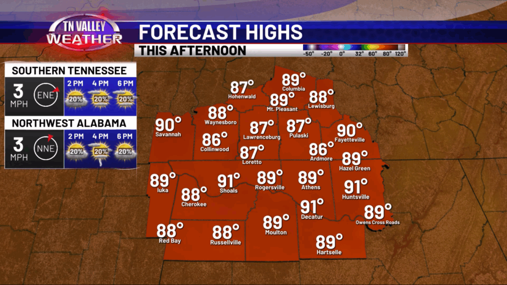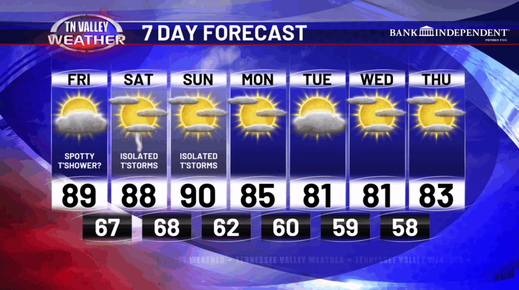 Happy Friday! We continue with the warm but not overly hot temperatures today and into the weekend. Today we will have highs in the upper 80s and lower 90s with some isolated showers and storms possible this afternoon and evening. Most places will just remain dry today. This evening, mostly dry conditions are expected for those Friday Night Football games, although an isolated shower or storm will be possible during the early evening hours. Lows will be in the upper 60s and lower 70s tonight.