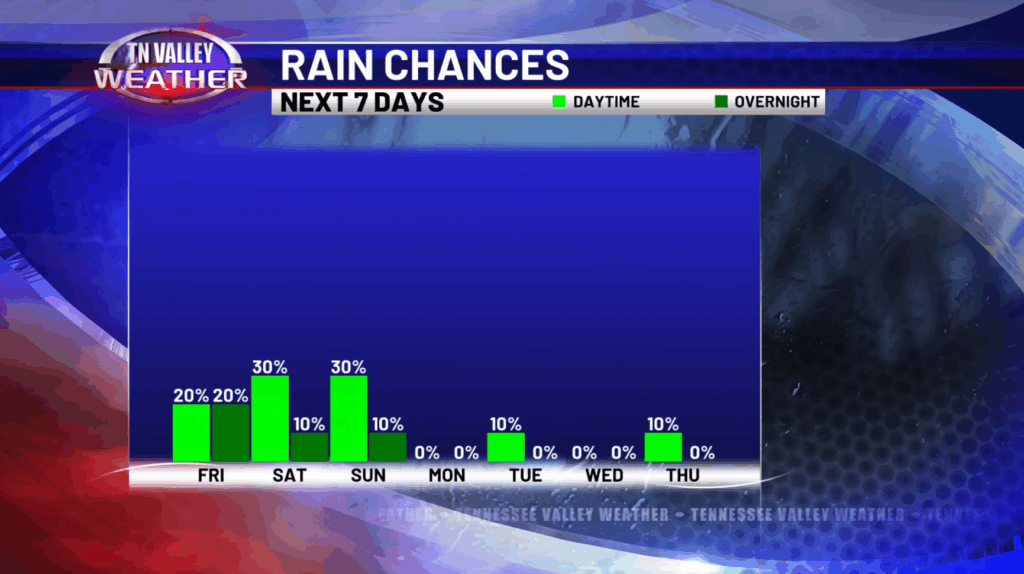 On Saturday, a slightly better chance at some isolated to widely scattered showers and storms is expected with highs back in the upper 80s and lower 90s. If you have any outdoor plans, be sure to keep an eye on the radar but there will be a lot of places that remain dry once again.