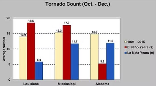 One factor in maintaining severe weather through late portions of the year is the cycle of the La Nina/El Nino. Here in the Valley, the correlation is not a necessarily strong one in terms of sheer tornado count, though if lesser frequency, higher octane systems do move through, they sometimes do indeed have the possibility of being higher impact with these more robust systems that can form during La Nina. For reference, in La Nina patterns, cold equatorial waters in the Pacific push the jet stream northward – high pressure is typically situated near Alaska, and This tends to lead to more variable and sharp jet stream patterns in the CONUS, which is a crucial ingredient for severe weather. Due to the orientation of these systems, they pull warm, moist air from the year-round fairly robust atmosphere of the gulf of Mexico, leading to those muggy warm days, highly conducive to severe weather. These patterns can form with any ENSO cycle, La Nina or not. One can point to many various significant severe weather days that have happened during both patterns!