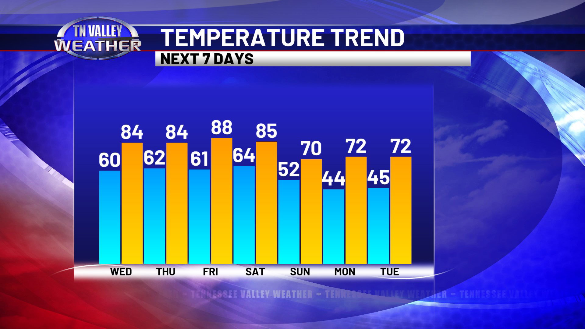 We’ll keep a few clouds into the overnight hours tonight. Lows will drop into the lower 60s for most of us. Daytime highs are up into the mid 80s again for Wednesday with partly cloudy skies and breeze southwest winds of 10 to 15 mph sustained, with gusts as high as 20 mph possible. Clouds will begin to gradually increase a bit as we head into Wednesday night, with the south to southwest wind continuing and overnight lows in the low to mid 60s.