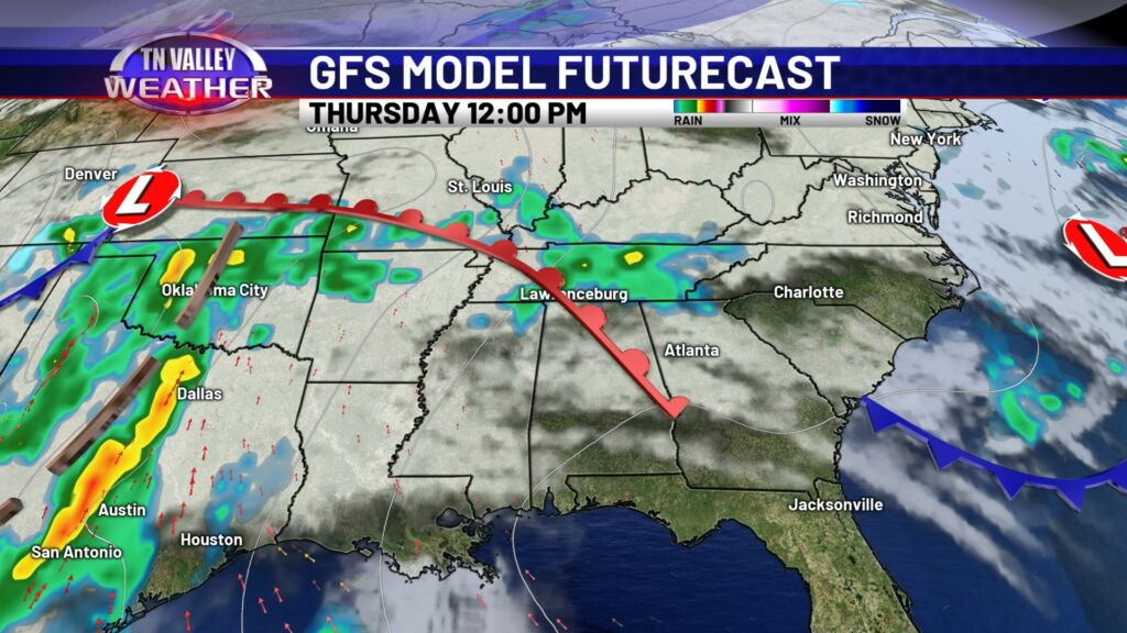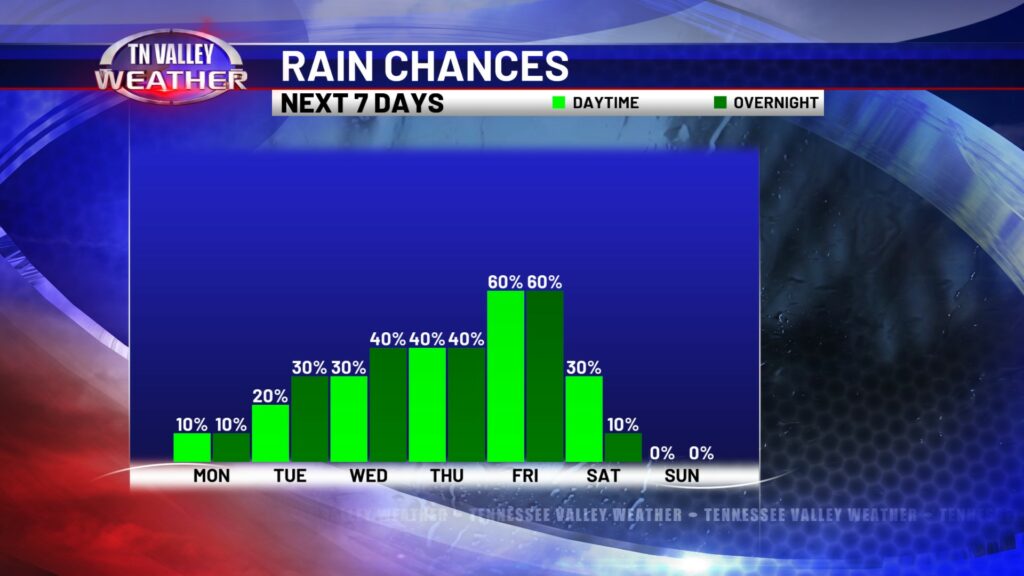 Wednesday features isolated to scattered showers and storms, but I’m leaning more towards thundershowers as opposed to thunderstorm activity here in the Tennessee Valley. Wednesday won’t be a washout, but again, we continue to gradually increase the rain chances.