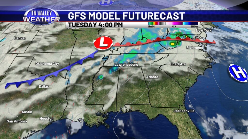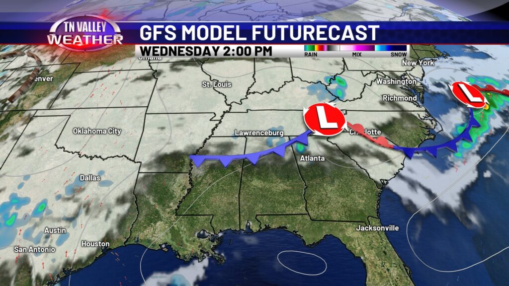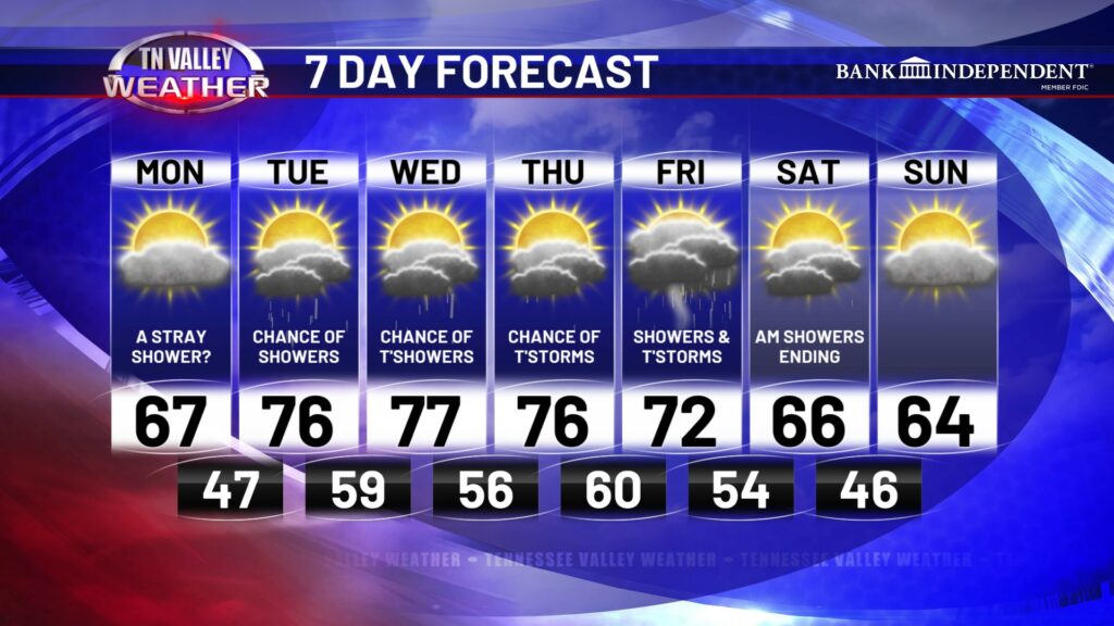 You’ll notice Tuesday will be a bit breezier with gusts from the south up to 20mph, bringing some much warmer air to the Tennessee Valley. Highs Tuesday will reach the mid to upper 70s. Expect a partly cloudy sky with a few showers, especially during the evening. Even so, chances are just isolated to scattered at best on Tuesday. But, our gradual rain chance increase trend continues.