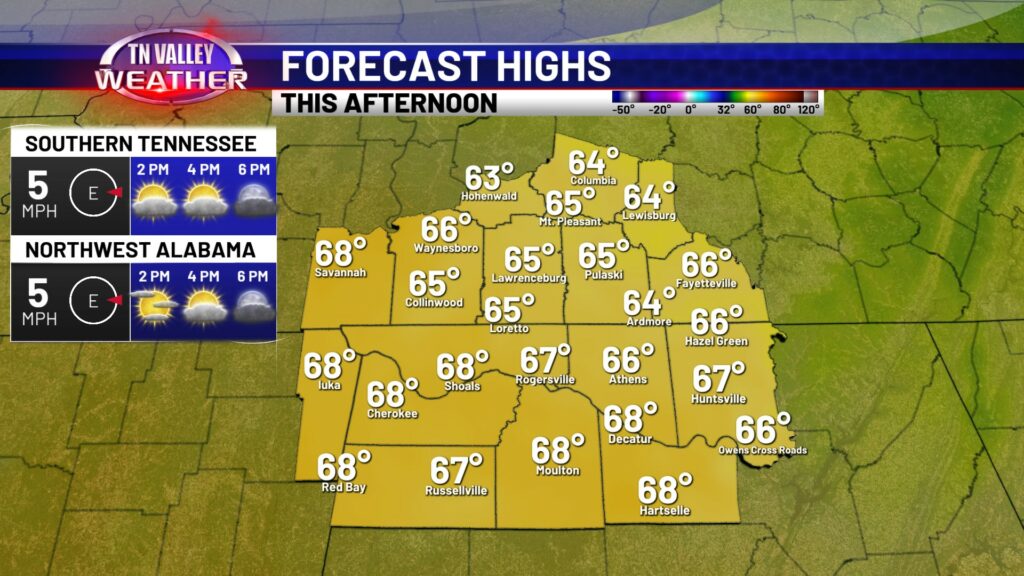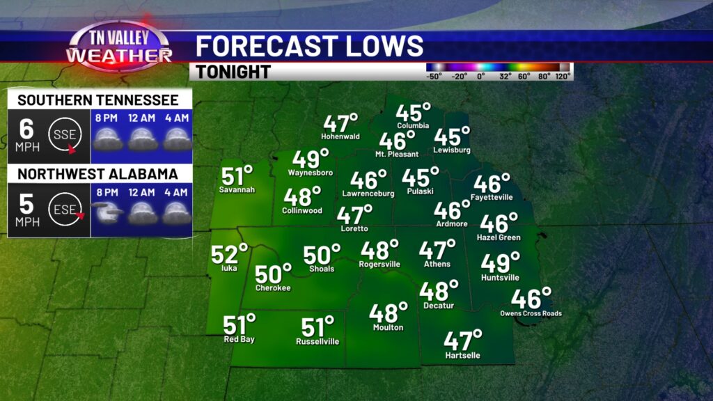 Good morning! Temperatures out there in the Tennessee Valley are off to a cold start, but a nice warm up in to the mid to upper 60s is what we can expect for this afternoon. Clouds will be around today after a sunny start. I cannot completely rule out a stray rain shower today or tonight, but most, if not all of us will remain dry. Tonight winds will begin to shift southerly with lows getting down into the upper 40s.