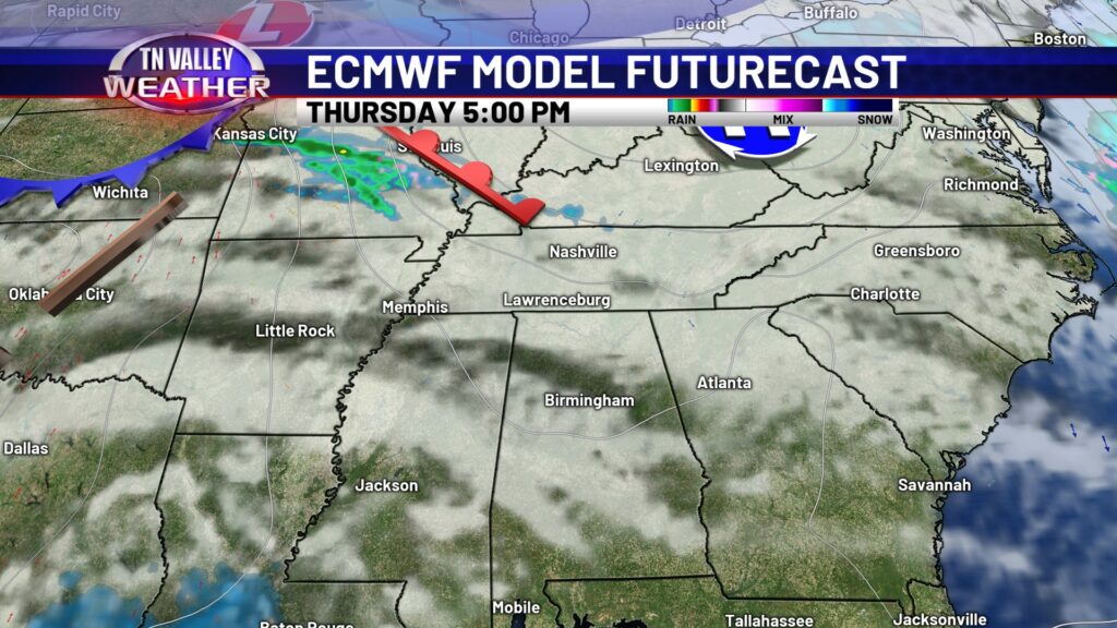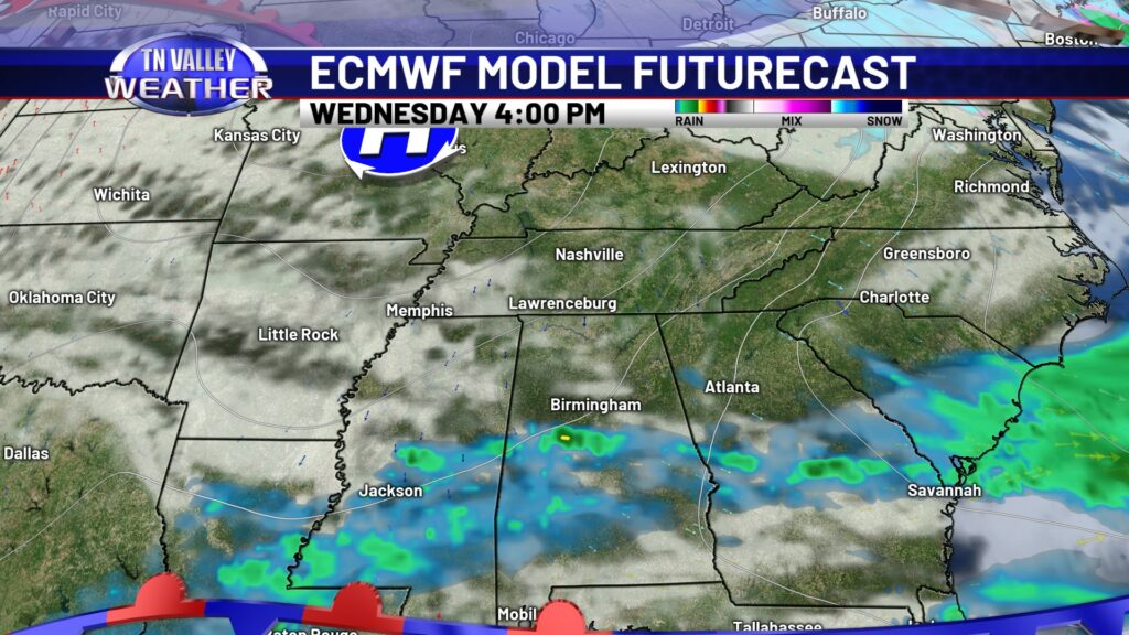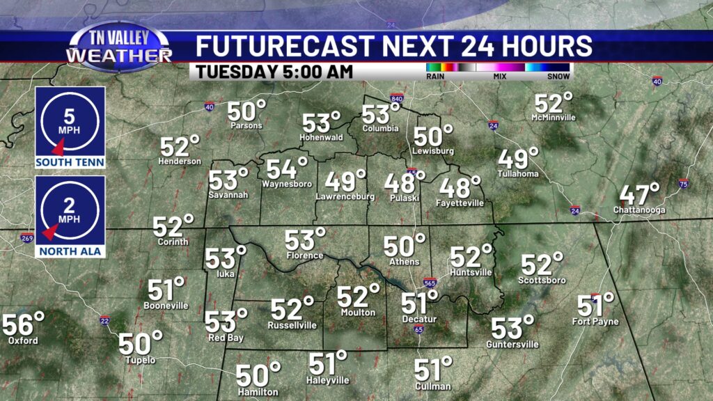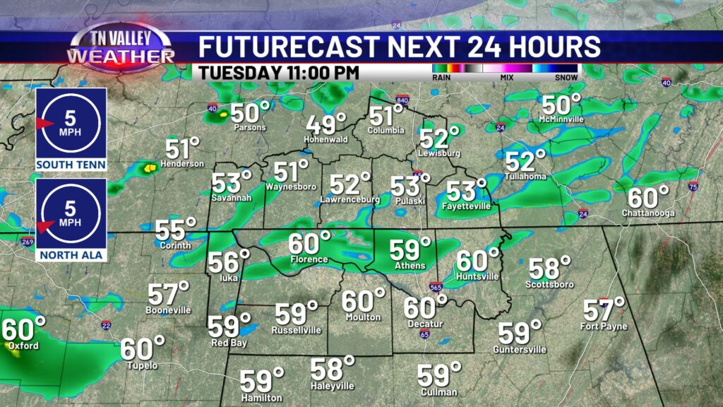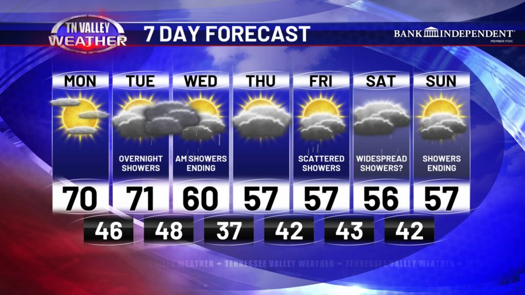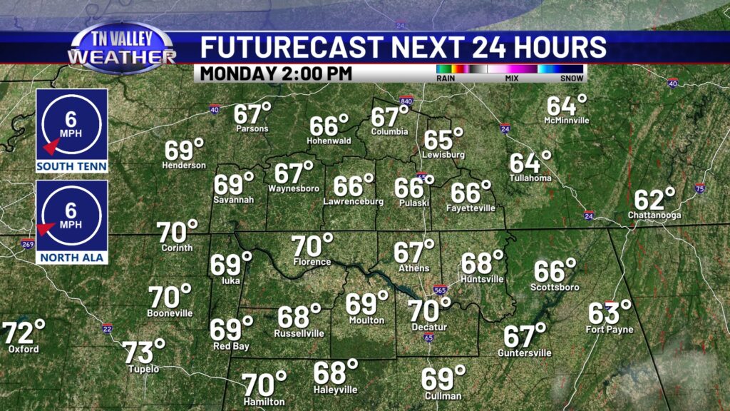 We’re off to a great start to the week in the weather department with temperatures making it hard to complain for those in the Tennessee Valley! Expect a mostly sunny sky today, with highs very comfortable in the upper 60s to lower 70s. Today is a day you will certainly want to spend outdoors. Clouds will move in and thicken up overnight, but we stay dry tonight with lows in the mid to upper 40s.