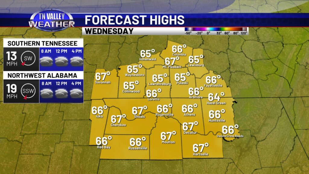 Clouds locked in firmly across the area on this Tuesday, keeping us in the 60s today despite a gusty southerly wind. Those clouds and southerly wind will be what keeps us on the warm side for February the next few overnights. We only drop down to the mid 50s tonight for overnight lows. With clouds hanging tough tomorrow as well, it’s looking less likely we’ll slide up into the 70s. We’ve pulled highs for Wednesday back to the mid to upper 60s. However, if you get a few decent breaks of sunshine, especially in north Alabama, hitting 70 won’t be impossible! Clouds and a gusty southwest wind stick around Wednesday night, and we may see a few spotty showers as moisture increases. Overnight lows will once again be in the mid to upper 50s.
