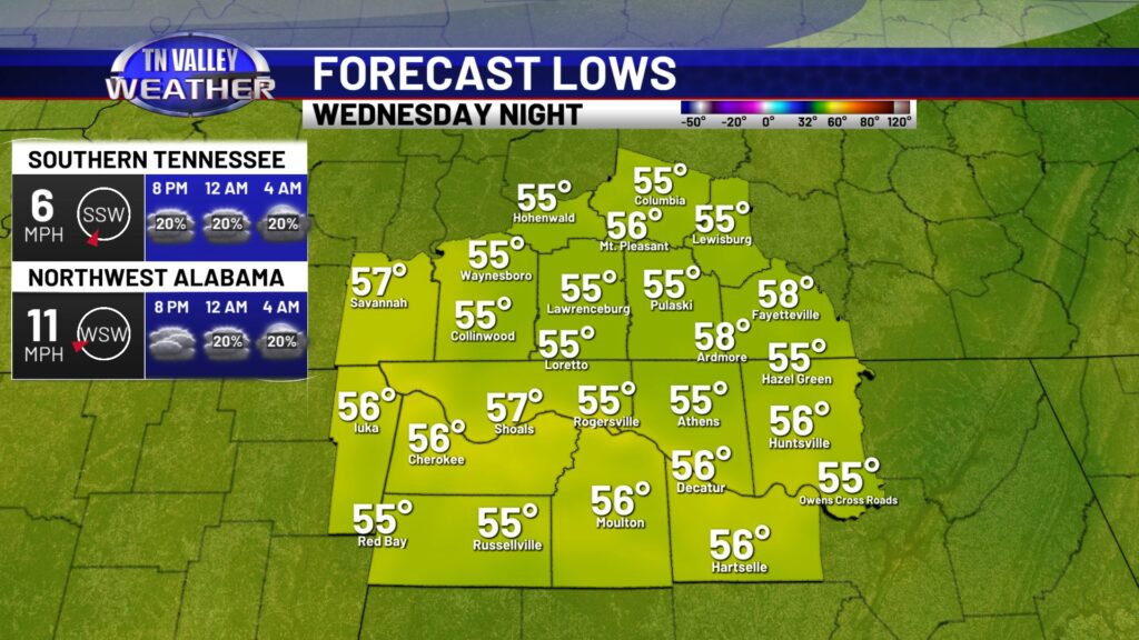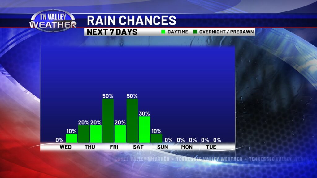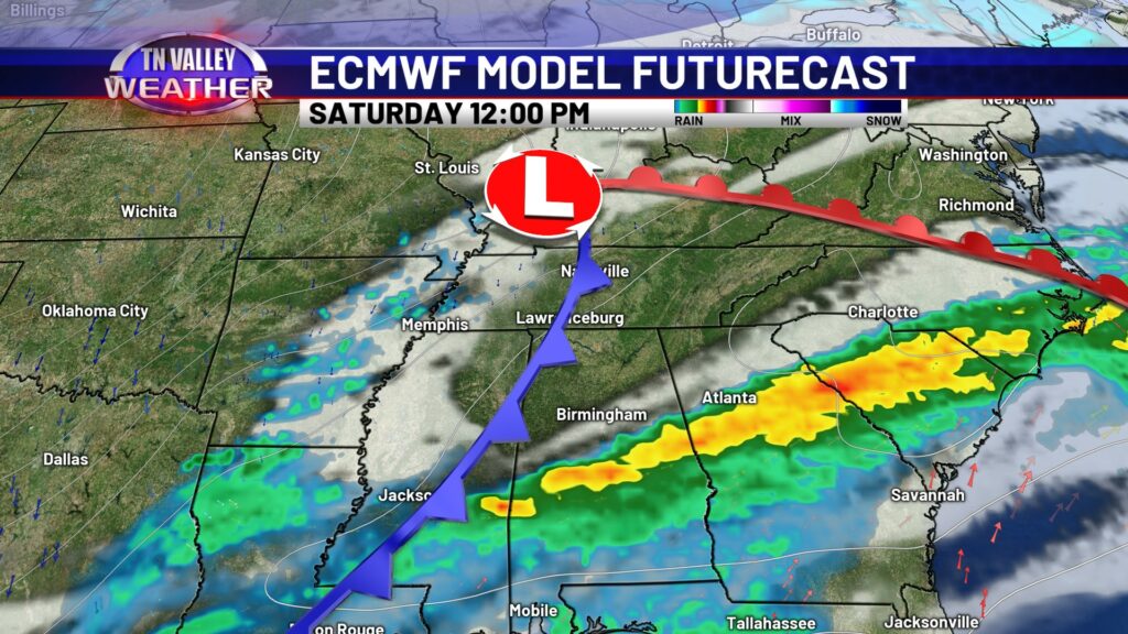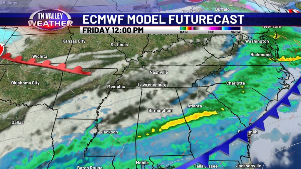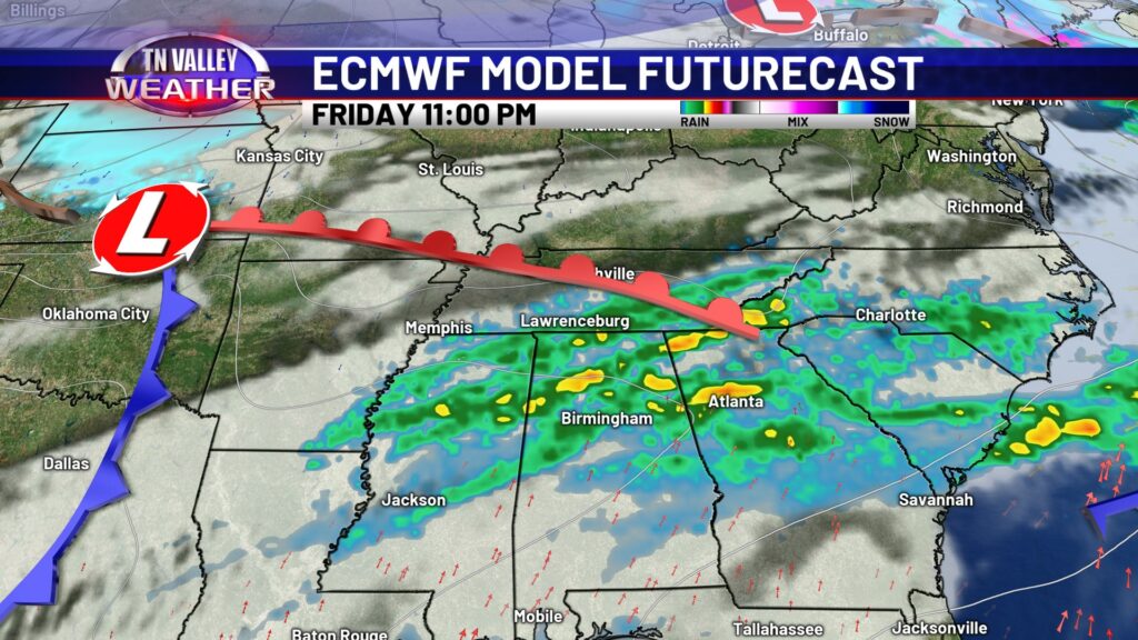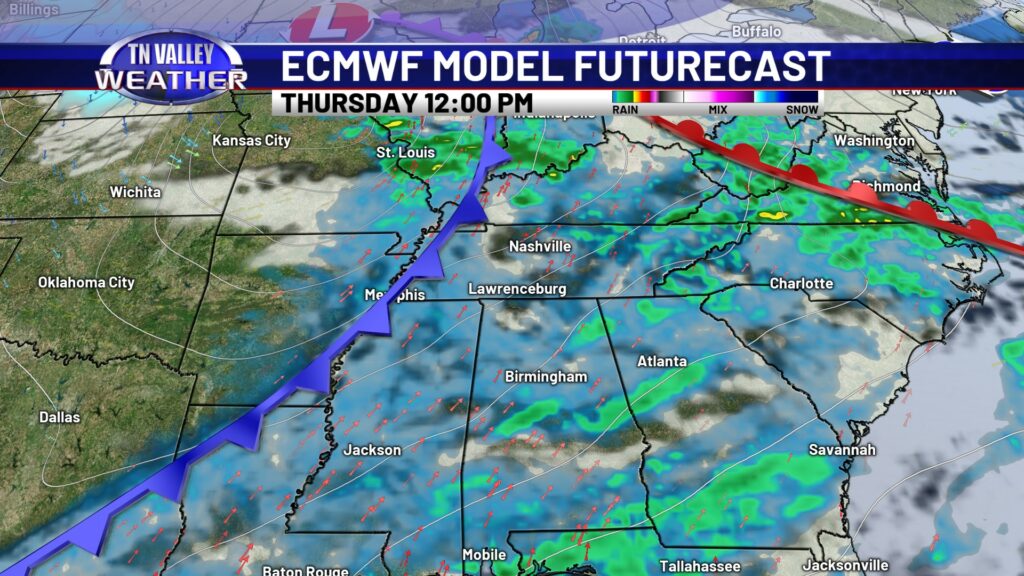 Thursday will be the warmest day of the week, as we look to have a stronger southwesterly wind and some mid-level dry air allowing for a few sun breaks. We look to climb into the mid 70s for most of the area, and a few spots in north Alabama and northeast Mississippi might end up in the upper 70s for highs. We can’t rule out a couple of spotty showers during the daytime, but better rain chances hold off until the overnight Thursday night as a cool front slides in. Scattered showers and storms look to be possible before shifting south of us with the front Friday morning. No severe storms are expected in our local area of southern middle Tennessee, north Alabama, and northeast Mississippi. That front waffles back north as a warm front Friday night with another round of scattered showers and thunderstorms possible. We don’t see any signs of those storms being severe at this time either. A few showers may linger into parts of Saturday, and then we turn colder again. Highs on Sunday are back into the 50s, and then we’re in the mid to upper 40s for highs with overnight lows back in the 20s by the beginning of next week. Winter isn’t quite done just yet!