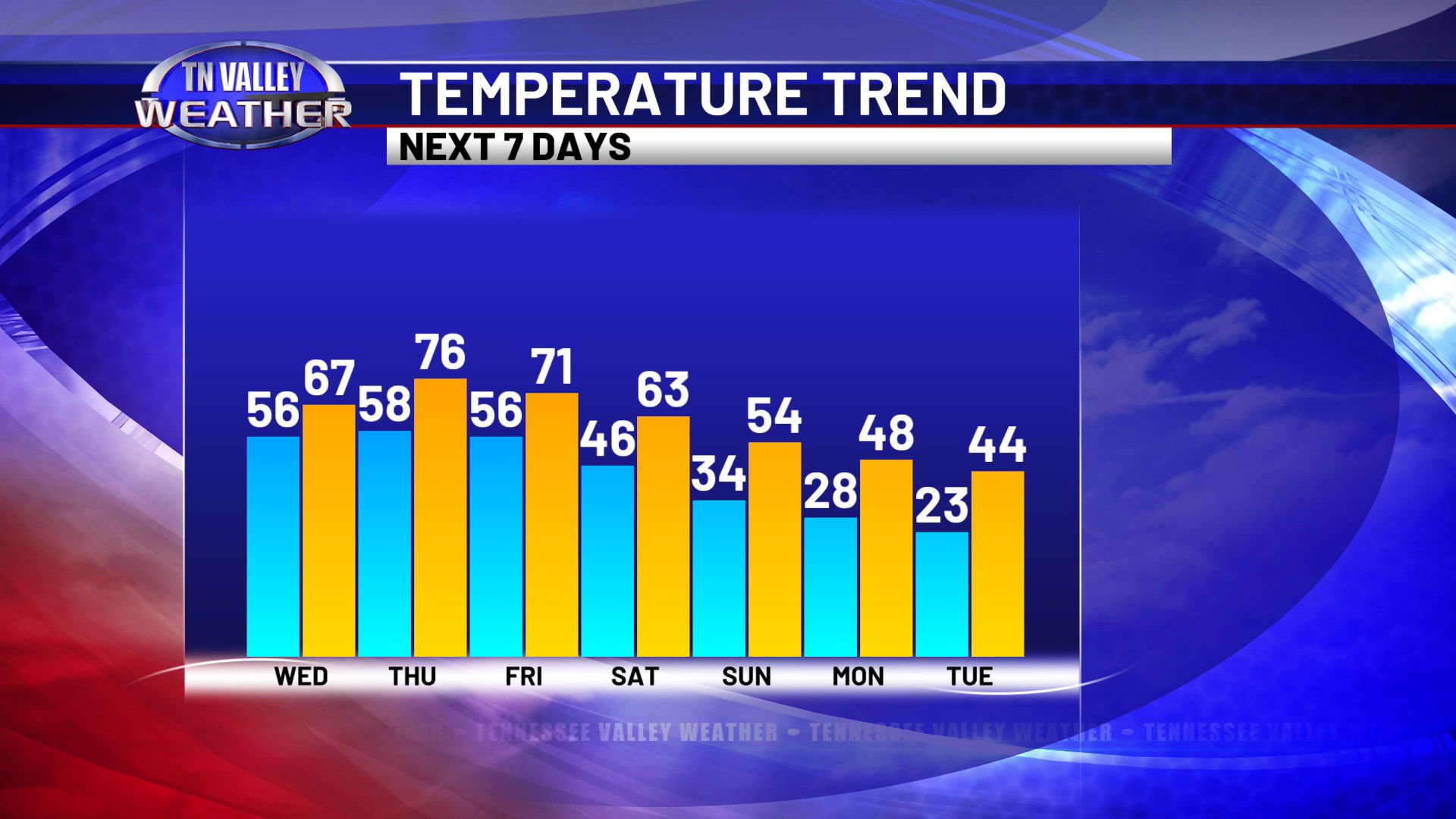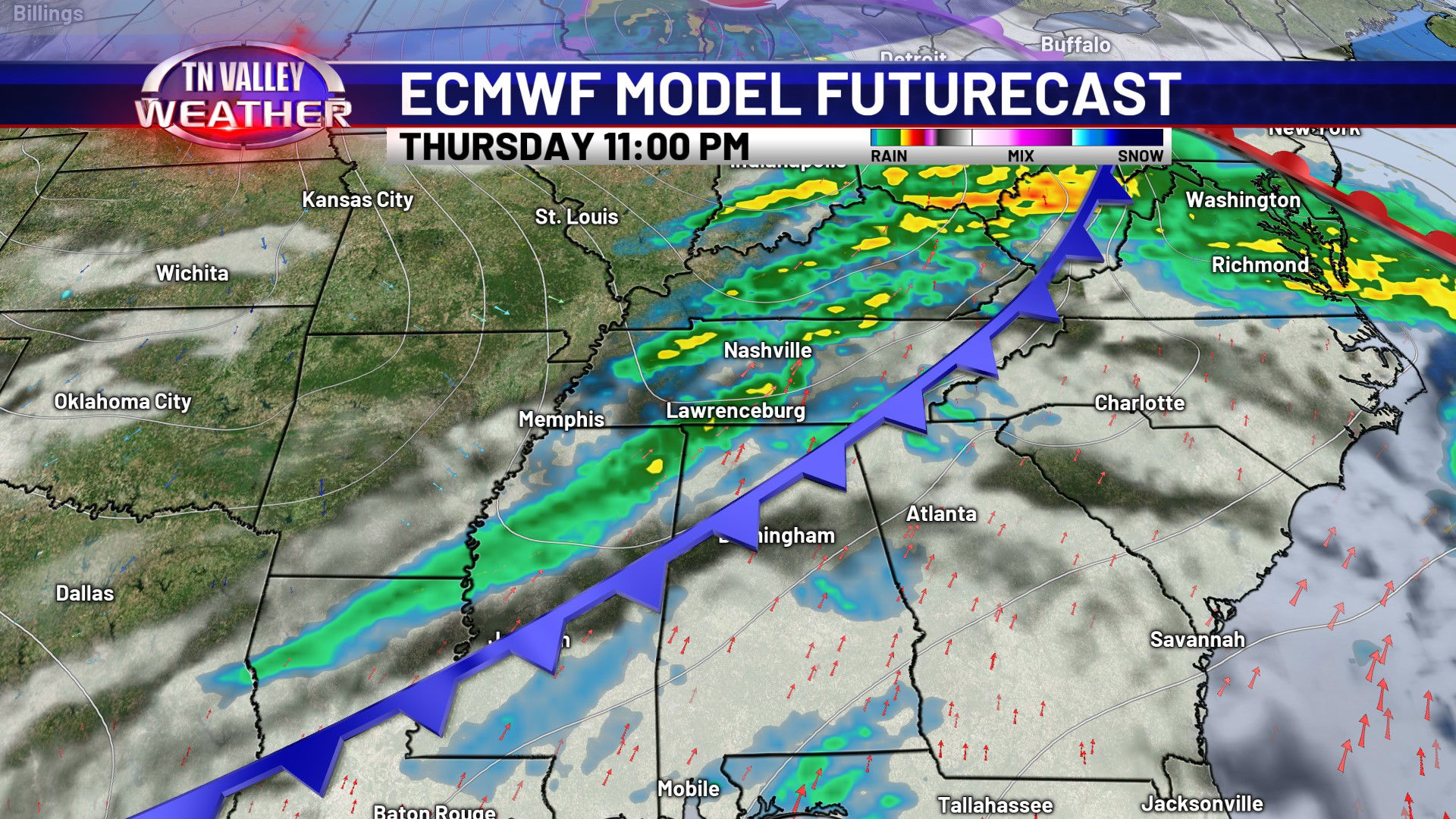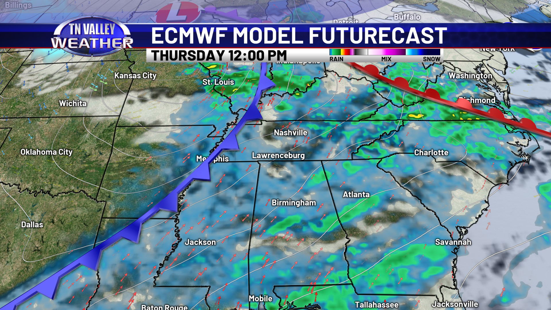 Thursday will be the warmest day of the week, as we look to have a stronger southwesterly wind and some mid-level dry air allowing for a few sun breaks. We look to climb into the mid 70s for most of the area, and a few spots in north Alabama and northeast Mississippi might end up in the upper 70s for highs. We can’t rule out a couple of spotty showers during the daytime, but better rain chances hold off until the overnight Thursday night as a cool front slides in. Scattered showers and storms look to be possible before shifting south of us with the front Friday morning. No severe storms are expected in our local area of southern middle Tennessee, north Alabama, and northeast Mississippi. That front waffles back north as a warm front Friday night with another round of scattered showers and thunderstorms possible. We don’t see any signs of those storms being severe at this time either. A few showers may linger into parts of Saturday, and then we turn colder again. Highs on Sunday are back into the 50s, and then we’re in the mid to upper 40s for highs with overnight lows back in the 20s by the beginning of next week. Winter isn’t quite done just yet!