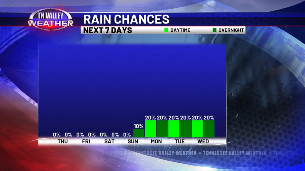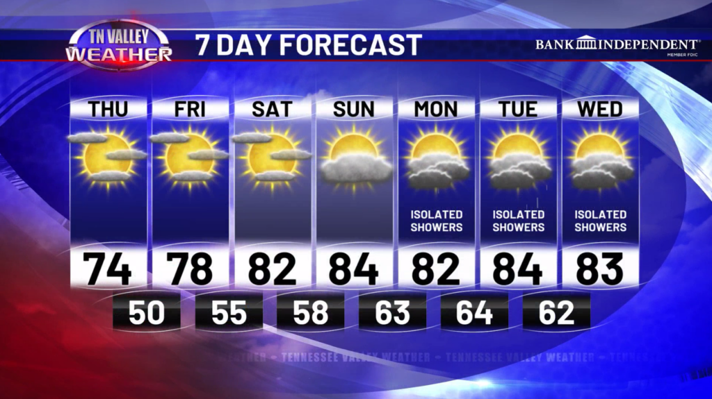 Saturday and Sunday will continue to be dry and warm with highs in the low to mid 80s. Some cloud cover will work its way into the area but there will still be a good amount of sunshine. Going into next week, we do see an increase in moisture across the area which could lead to some isolated showers. Right now, the better rain chances will remain to our west until we get into the Wednesday and Thursday time frame when we could see more scattered activity.